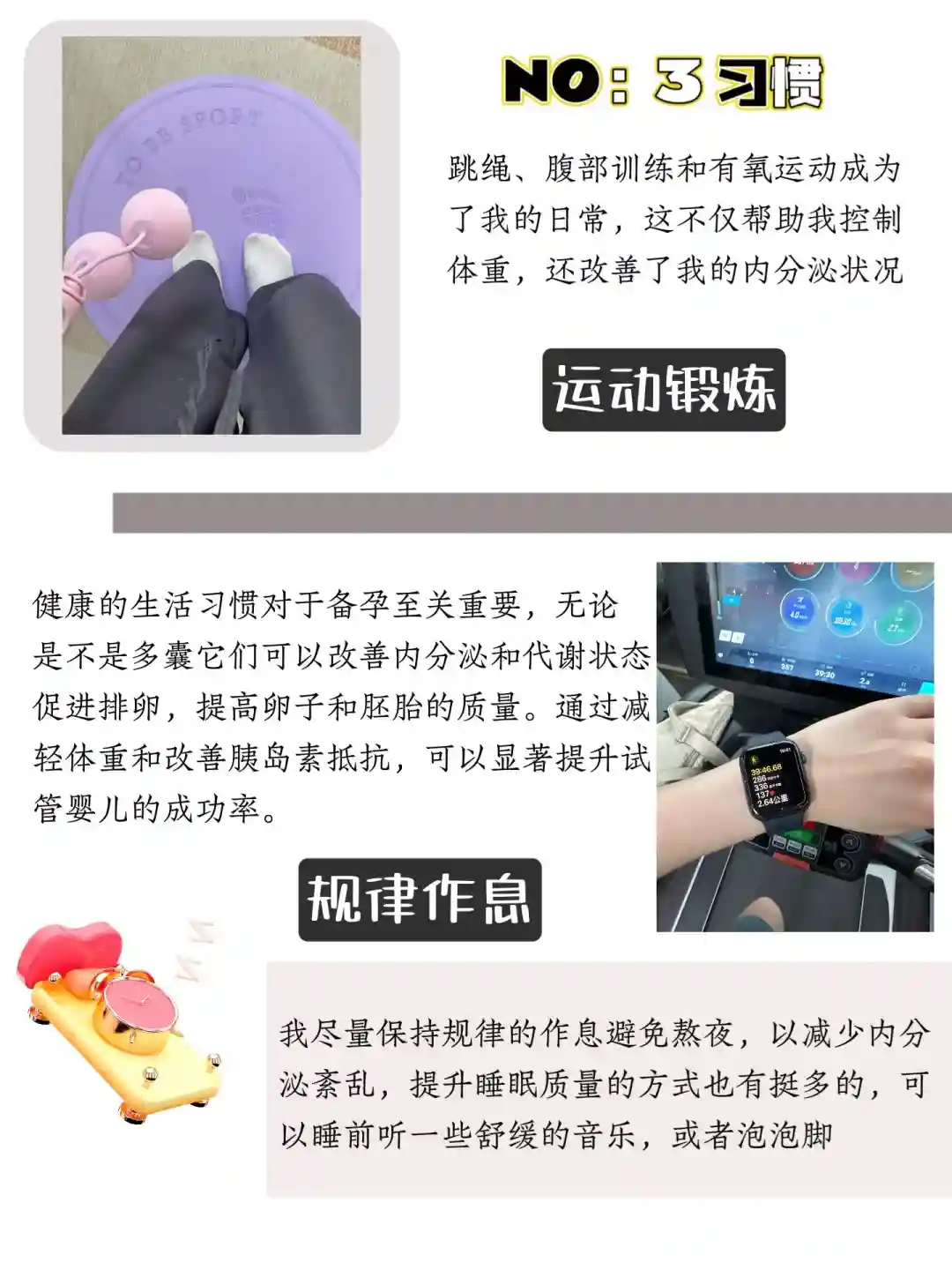 2.运动锻炼:跳绳、腹部训练和有氧运动成为了我的日常,这不仅帮助我控制体重,还改善了我的内F泌状况
