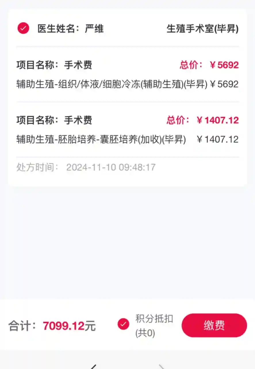 4.费用方面,不算胚胎冷冻费,实际支出差不多1.2,杂七杂八所有都算上了。双方加起来医保报销4532,如果两次报销机会用完还要促的话,就是1.65,比去年vip一促一移便宜了太多太多,去年算上宫腔镜一共7+。11月10日更新:以前办的特需,不知道胚胎还有单独的冷冻费,一管1423,就让第三天的胚胎宝宝也都住的单间囊胚培养费1407一枚,1423×4+1407=7099元。本周期实际支出1.91。