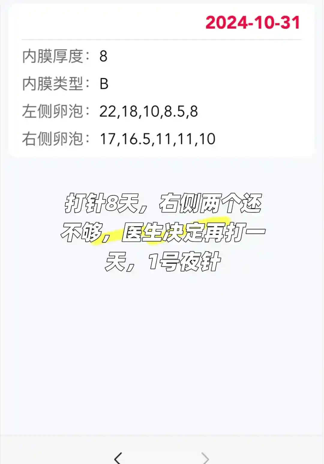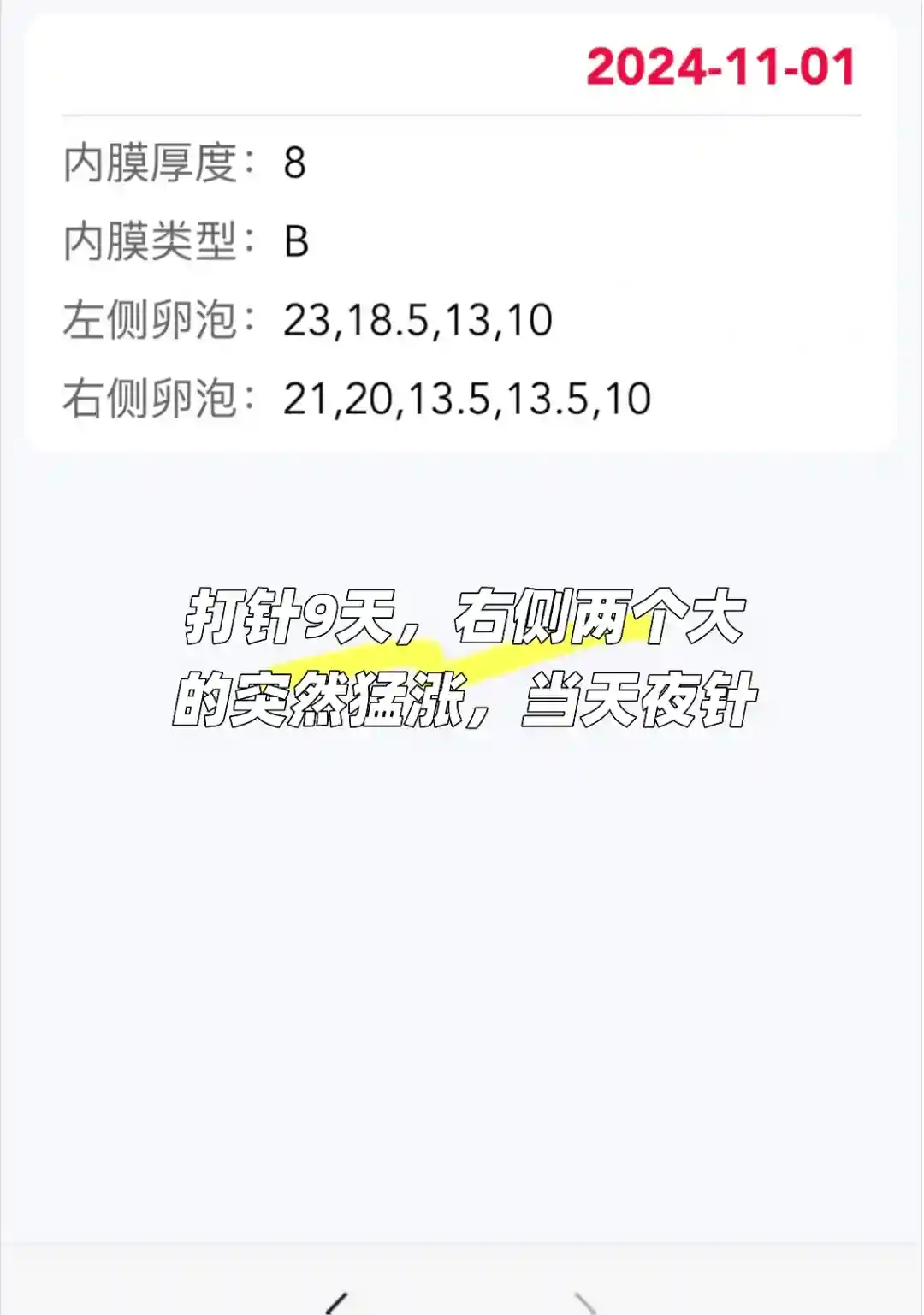 2.进周左侧5个,8.5.4.4.3,右侧一个3。因为左侧大点的泡,吃了3天氯米芬。一开始就做好可能会放掉大的保几个小泡的打算,最后左侧取1,右侧取3,不知道左侧是空泡还是怎么,反而右侧夜针当天13.5的应该取到了。这也反映了一个情况,去年18的时候打夜针,取到了,这次21打夜针也能取到,不用太过担心超过20卵泡过熟的问题。
