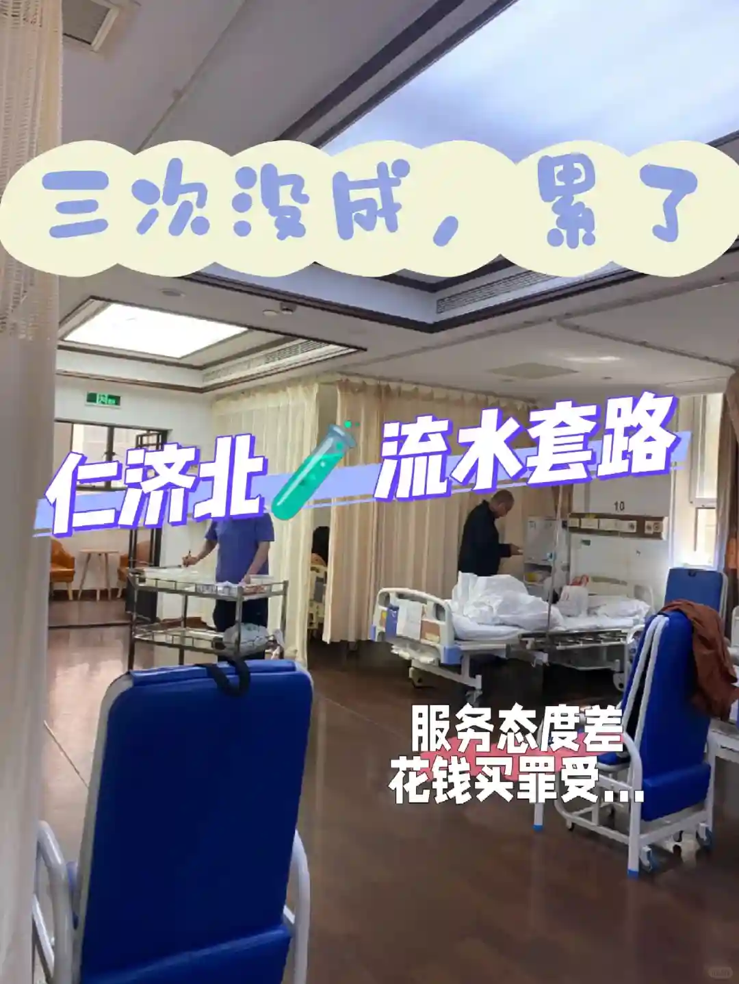 过程受尽折磨:我记得促排的时候一次就得待一天!服务态度真的是不敢恭维…我去7诊室也就是促排前准备工作登记的地方,登记的小姑娘真的口含金豆呀,多问一句都觉得呛到她了…