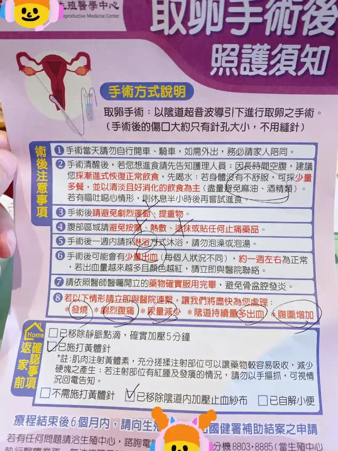 大約40分鐘左右的時間護理師會叫醒,這時候就已經全部弄完了,醫生會過來說取了多少顆,還不太能說話只能點頭和微微睜眼,肚子一點點痛,像生理期那樣