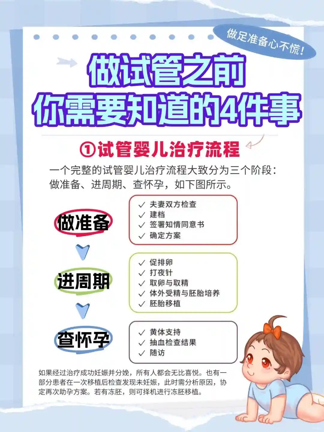 ✨一个完整的试管婴儿治疗流程大致分为三个阶段:做准备、进周期、查怀孕。
