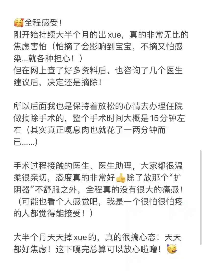 最后是在咨询了第三个医生后,她给我建议后也给了我很大的信心和勇气,我才决定做摘除的!
