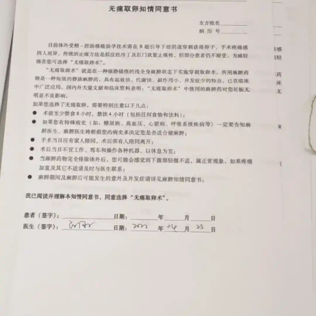 🍀进去15诊室做B超,医生说可以打夜针了,16颗,麻醉吧?我说麻醉麻醉!医生就让转身签无痛麻醉单(图2),签完交给医生,人到诊室外接着等。