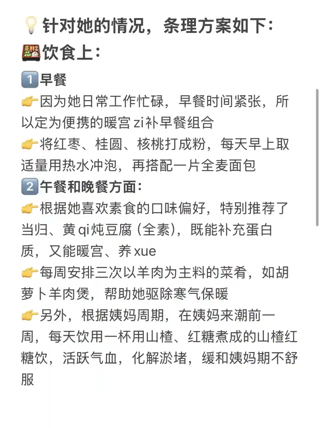 👉根据她喜欢素食的口味偏好,特别推荐了当归、黄qi炖豆腐(全素),既能补充蛋白质,又能暖宫、养xue