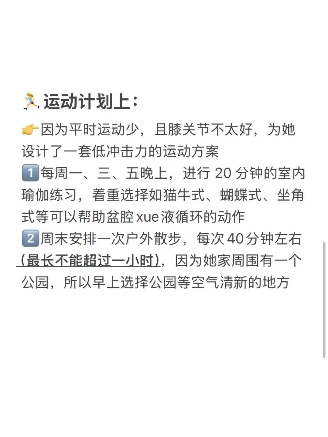 🏃♀运动计划上:👉因为平时运动少,且膝关节不太好,为她设计了一套低冲击力的运动方案