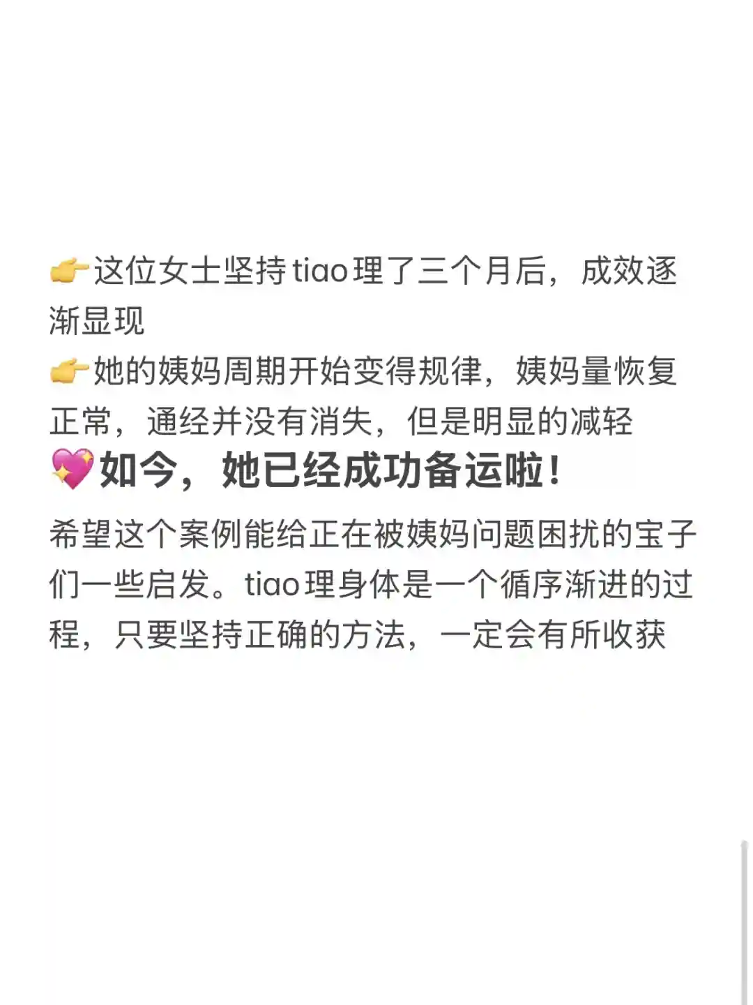 希望这个案例能给正在被姨妈问题困扰的宝子们一些启发。tiao理身体是一个循序渐进的过程,只要坚持正确的方法,一定会有所收获