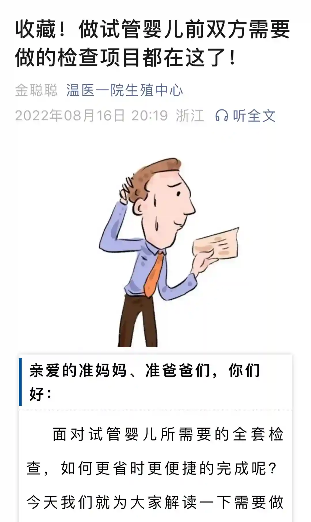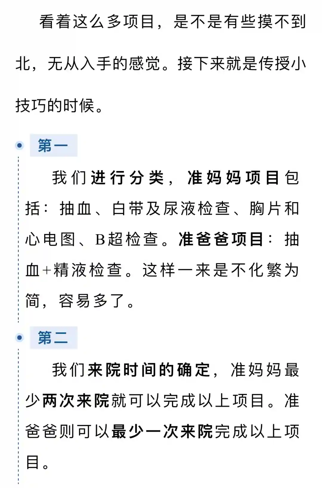 这就需要有一个能干的准妈妈为您效劳,开具试管婴儿全套化验单,并帮您预约好精液检查时间,您只要依据预约时间来院一次性完成抽血及精液全套检查就好。
