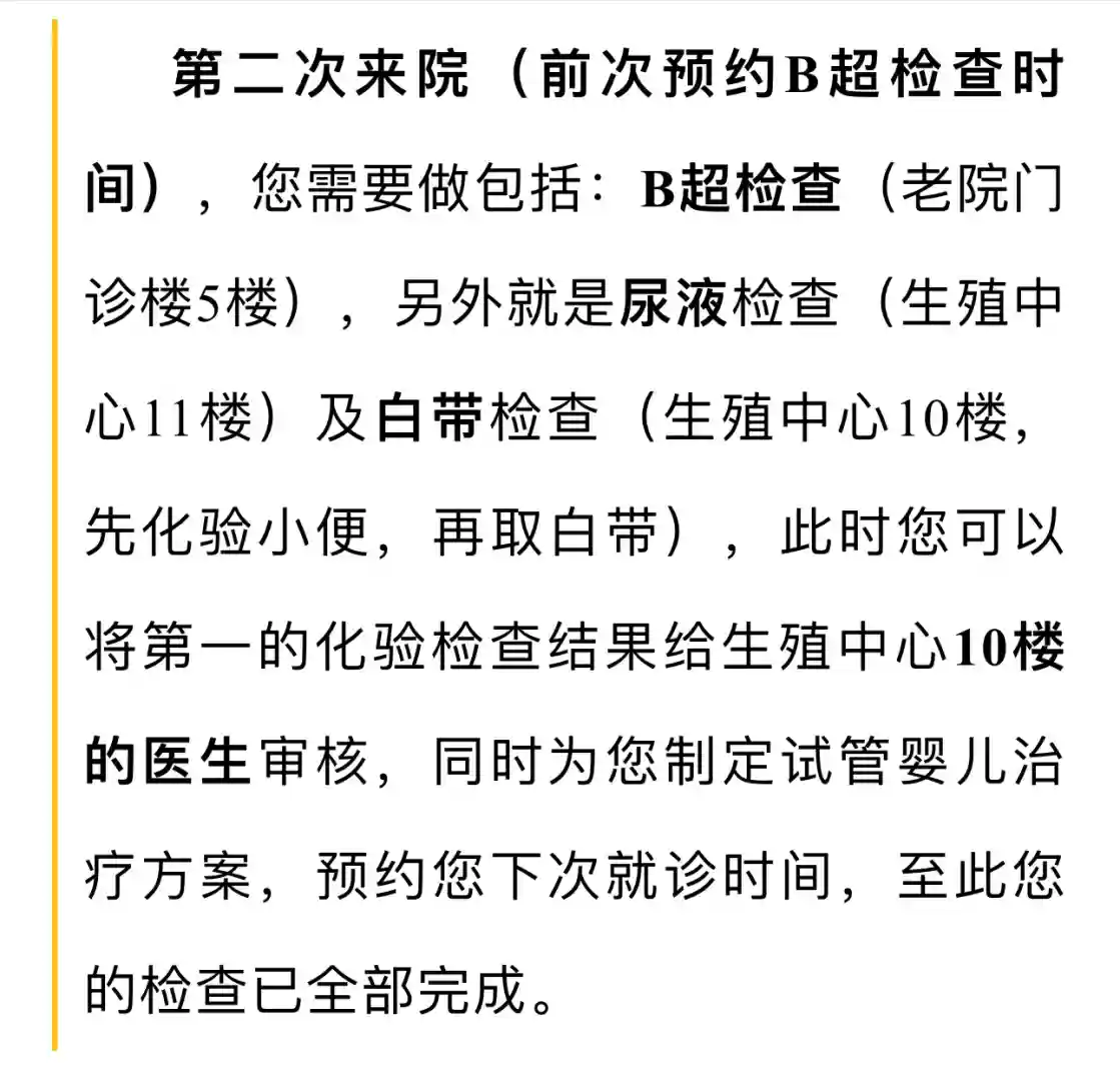 2️⃣第二次来院(前次预约B超检查时间),您需要做包括:B超检查(老院门诊楼5楼),另外就是尿液检查(生殖中心11楼)及白带检查(生殖中心10楼,先化验小便,再取白带),此时您可以将第一的化验检查结果给生殖中心10楼的医生审核,同时为您制定试管婴儿治疗方案,预约您下次就诊时间,至此您的检查已全部完成。