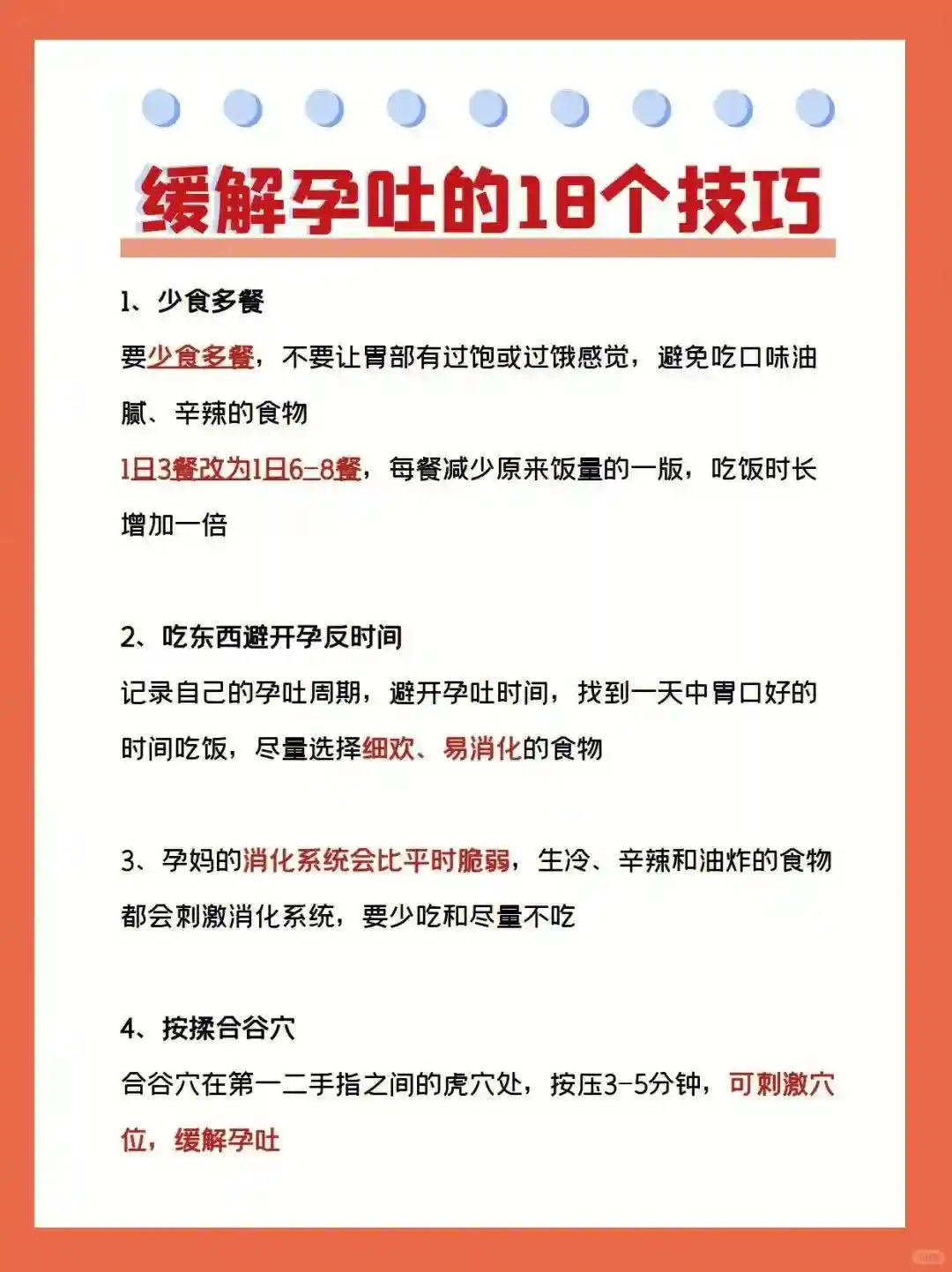 ✅少食多餐 ✅吃东西避开孕反时间 ✅尽量不吃生冷 油炸 辛辣食物 ✅按揉合谷穴 ✅小口喝水 ✅家里除味 ✅分散注意力或适当活动 ✅口服维生素b6 ✅及时记录孕反食物 ✅保持充足睡眠 注意休息 ✅吃点酸的食物 ✅喝点苏打水吃点苏打饼干 ✅选择高蛋白食物 低脂低盐饮食 ✅选择合适的烹饪方式 ✅穿宽松衣服 ✅床头备食物 ✅喝陈皮茶 姜茶 ✅吃一些防止孕吐水果 适量吃一吃 以上这些小技巧都是我亲身尝试有效~ 孕吐严重姐妹可以尝试一下哦,希望大家都可以尽快度过这个过程 ㊗孕妈妈在孕期一路绿灯😘#怀孕那些事 #每天都有值得记录的瞬间 #孕期就是一直在闯关