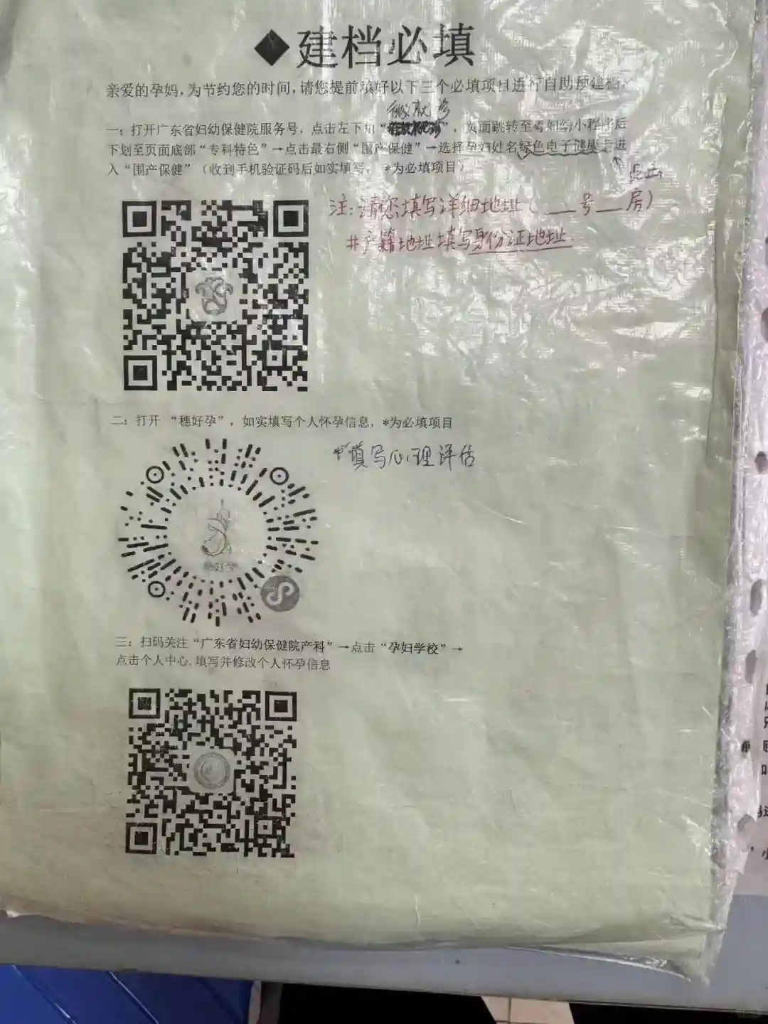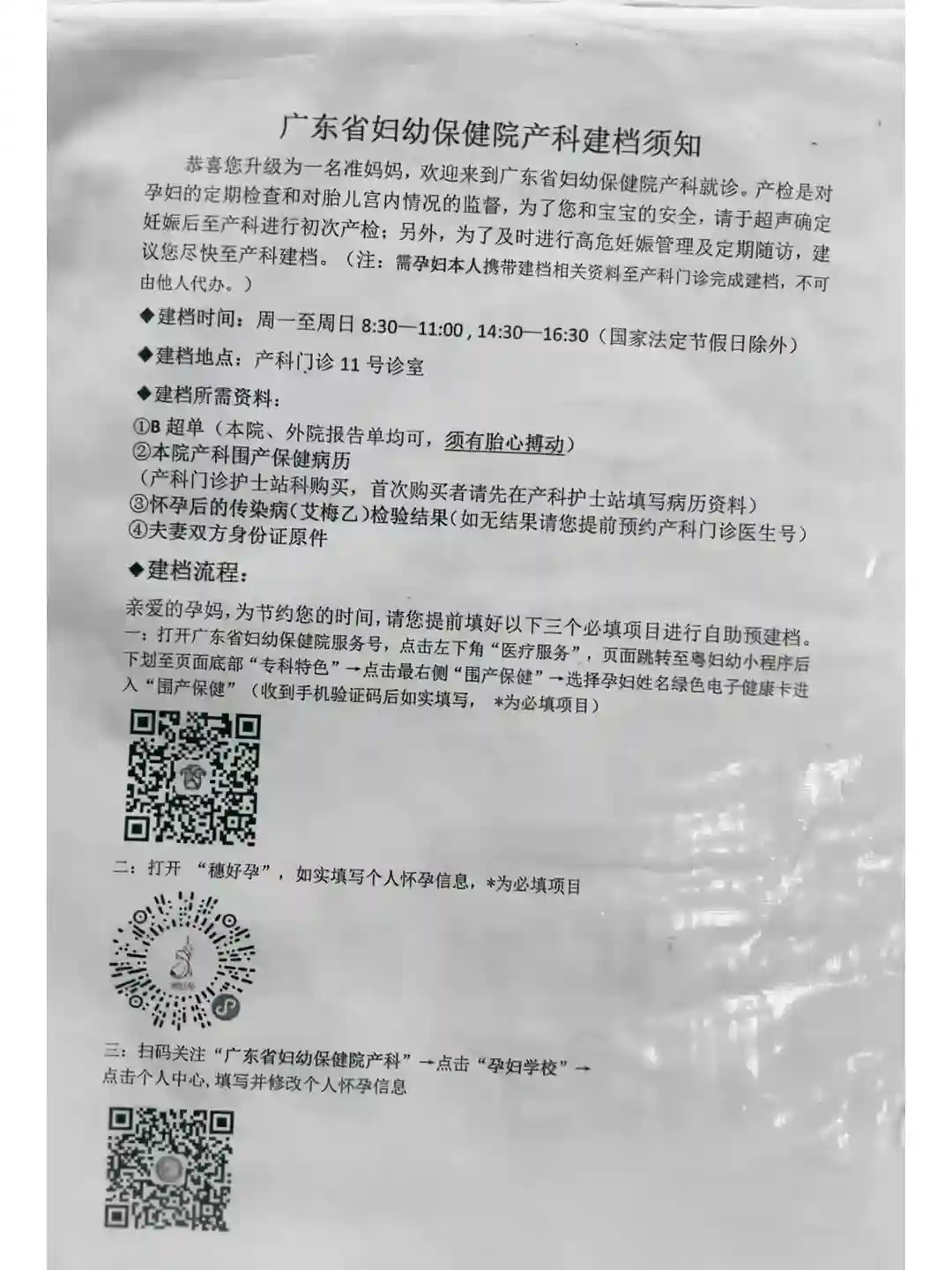 需要带齐以下资料,然后去11号诊室建档(建档前需扫码填写资料“见图1”),建档时还会有一些宣讲,是关于挂号、脐带血知识、看急诊、分娩时单间、普通病房和一体化等的介绍