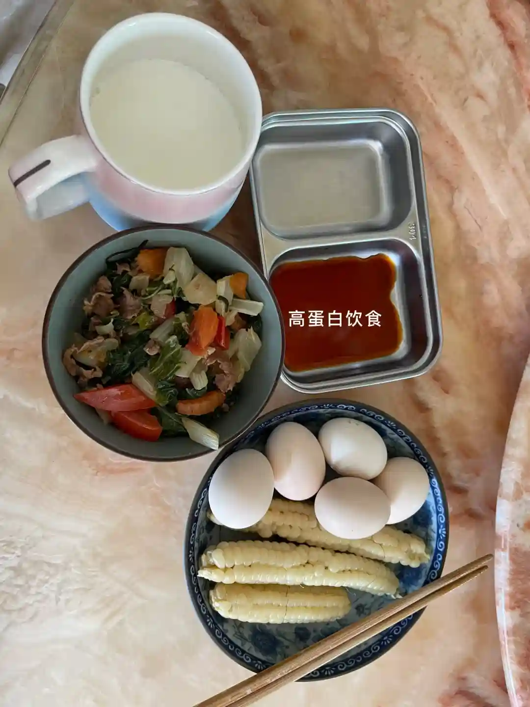 坚持高蛋白饮食:鸡蛋、豆浆、牛奶、肉跟海鲜类的,鸡蛋可以一天吃5 6个,只吃蛋白,同时每天喝一杯蛋白粉,补充高蛋白
