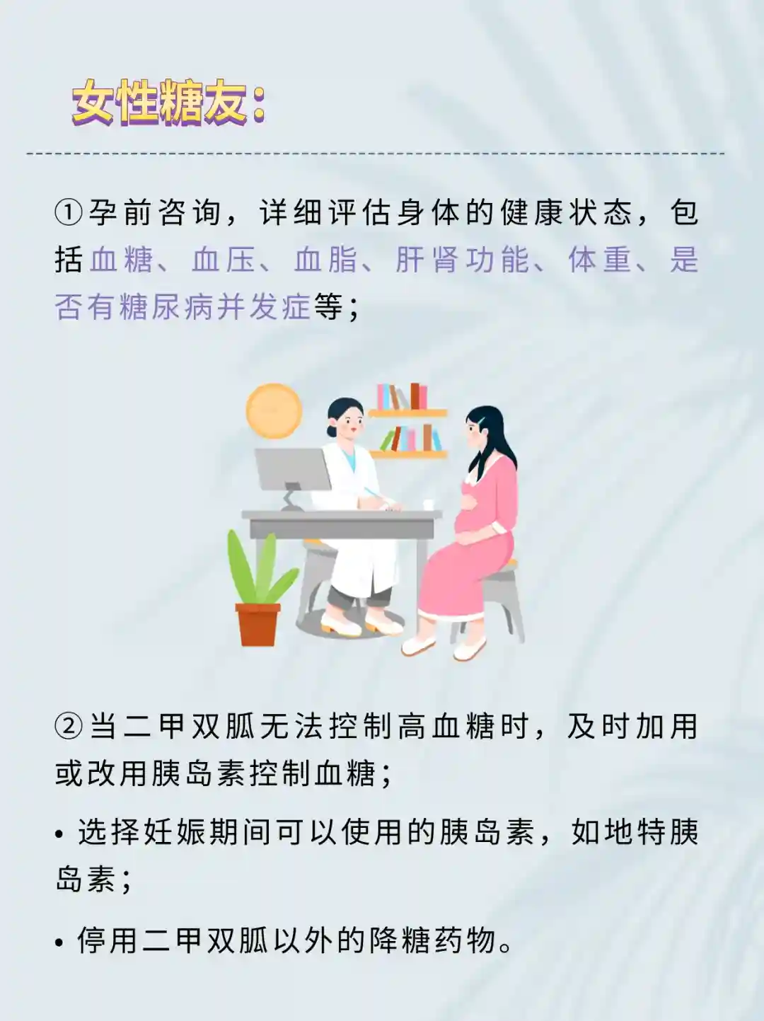①孕前咨询,详细评估身体的健康状态,包括👉血糖、血压、血脂、肝肾功能、体重、是否有糖尿病并发症等;