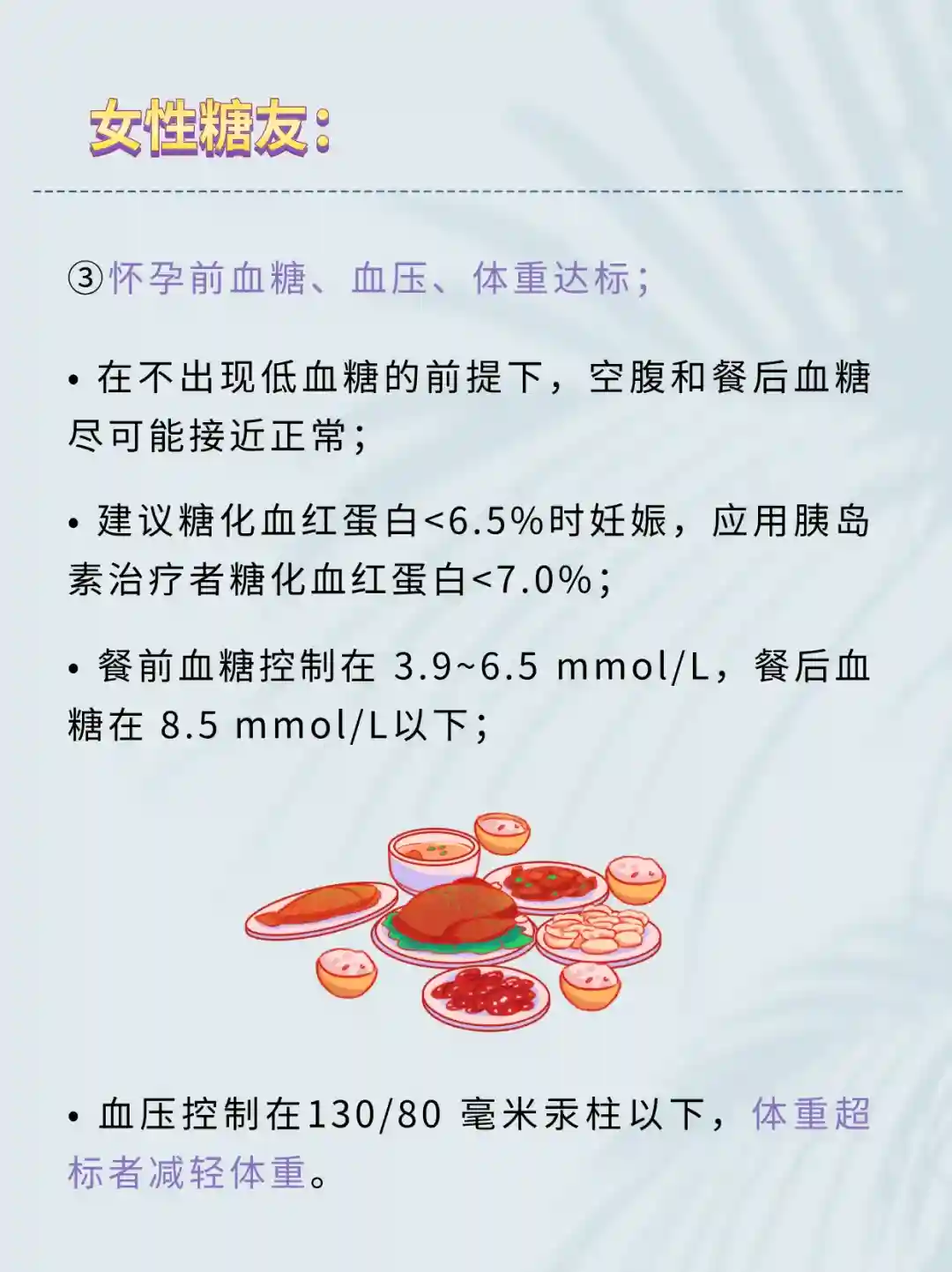 ③怀孕前血糖、血压、体重达标;在不出现低血糖的前提下,空腹和餐后血糖尽可能接近正常;