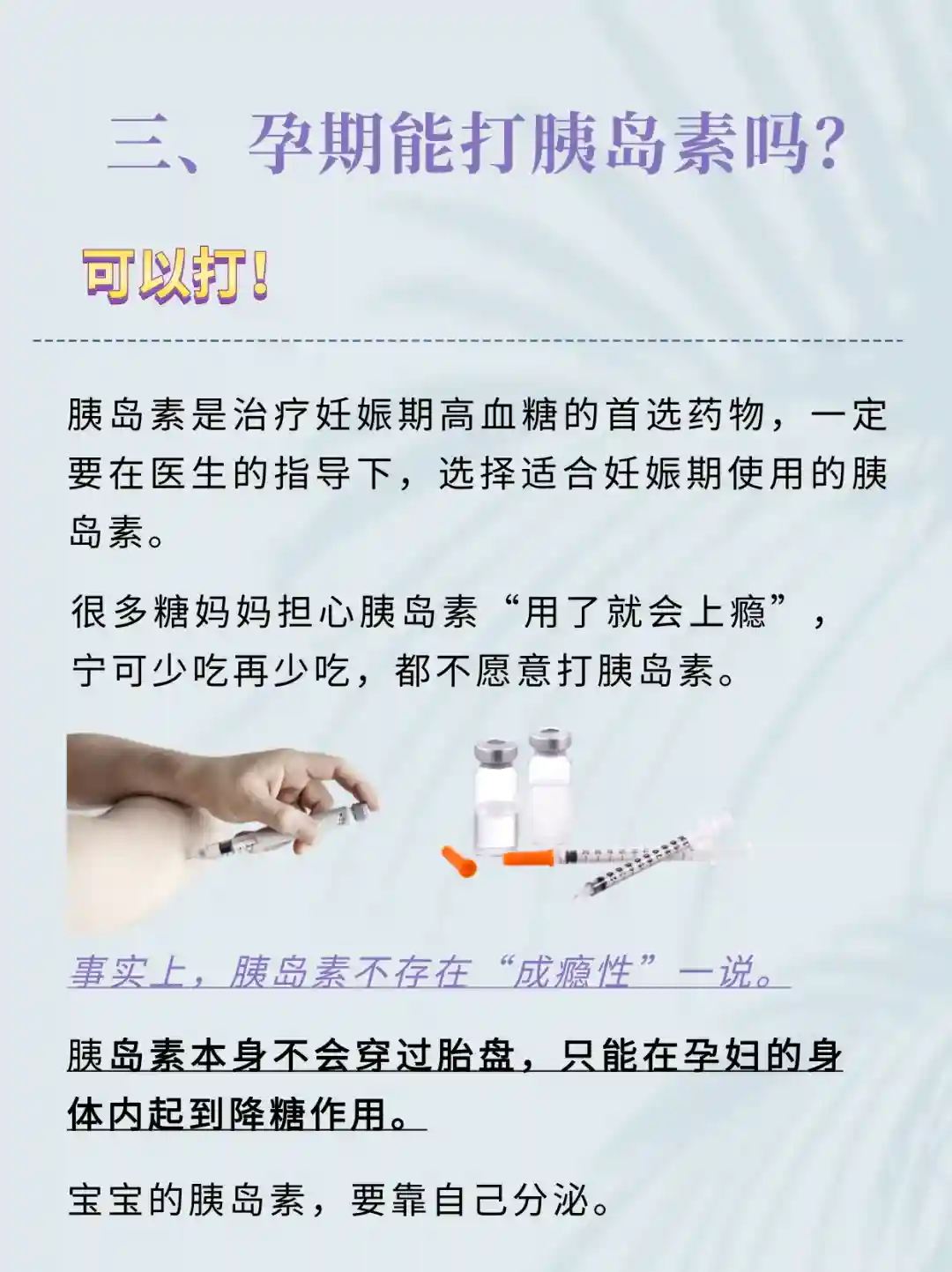 ②当二甲双胍💊无法控制高血糖时,及时加用或改用胰岛素控制血糖;选择妊娠期间可以使用的胰岛素,如地特胰岛素;停用二甲双胍以外的降糖药物。