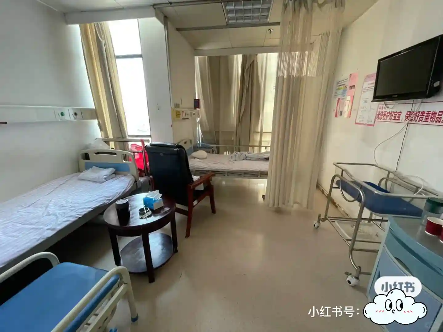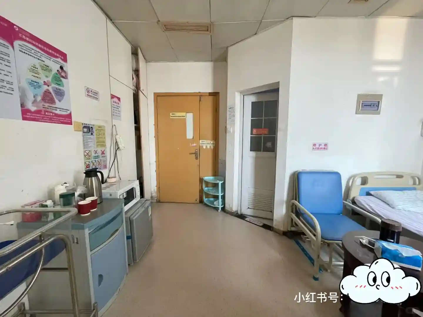 (独立病房产后是300一天,老院环境真是一般,我是第二天中午出的院,就住了一晚上,图的也就是个清静,独立病房在10楼,如图小单间,里面有配备热水瓶和冰箱,可以储存母乳,热水是24小时的,门锁是需要交押金办房卡的)