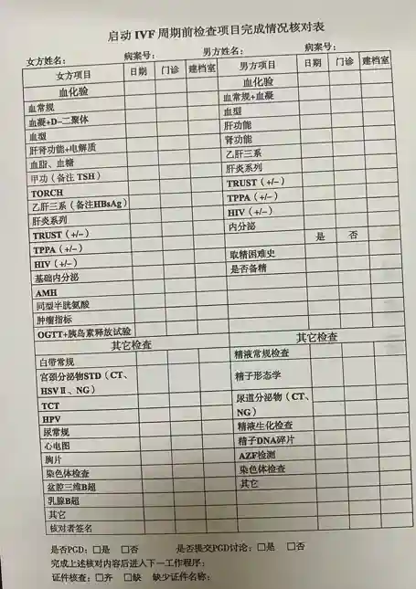 #怀孕了 了加上家里催得急就决定直接做试管🧪了,下面跟姐妹们分享一下妇保的试管流程:1.完善前期检查,检查内容如图一,女方挂生殖内分泌科,男方挂男科号,如果你在其他医院做过检查可以带上,就诊时医生会查漏补缺,把化验开齐。