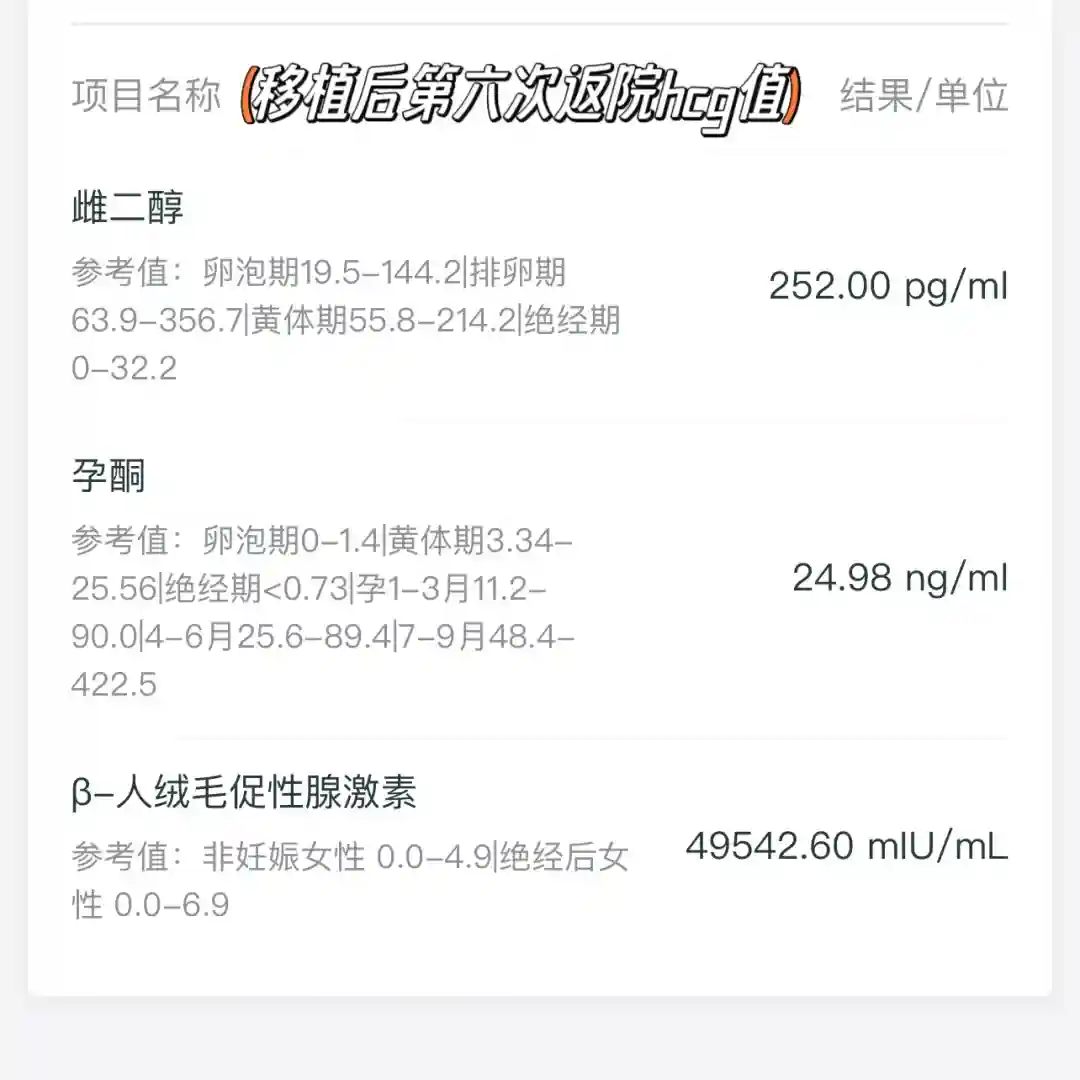 第六次,5天后返院hcg49542.6,孕酮24.98,雌二醇252,个人觉得血值偏低,问了大白,说也算正常,但是还是给我配了肝素,上次因为有点出血所以肝素停了,今天开始继续打上。还问了后续什么时候可以预约产科的特需医生,约了下次挂个特需号,在做一次b超就可以预约了(这个时候,已经胎停2天了,由于没有做b超不知道已经没了,还觉得血值低)