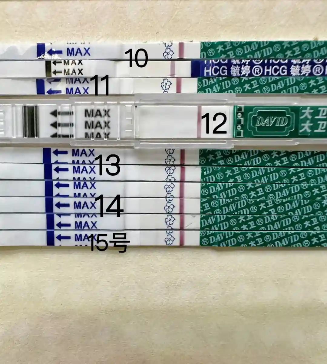 大姨妈推迟第三天,也就是1.9号开始测孕,一直白板,直到13号出现灰印,14号电子验孕棒显示怀孕,但一直很淡,急忙赶往医院验血。
