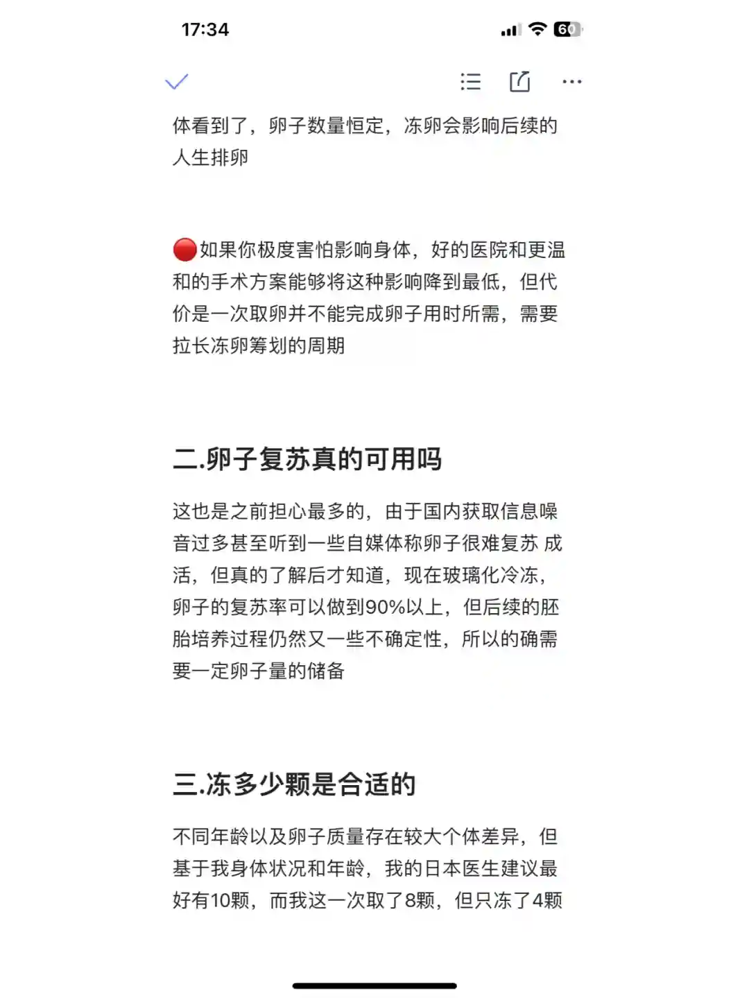 年龄以及卵子质量存在较大个体差异,我的日本医生建议最好有10颗,而我这一次取了8颗,但只冻了4颗,卵子复苏后涉及到培养胚胎一系列不确定性,的确卵子越多越好