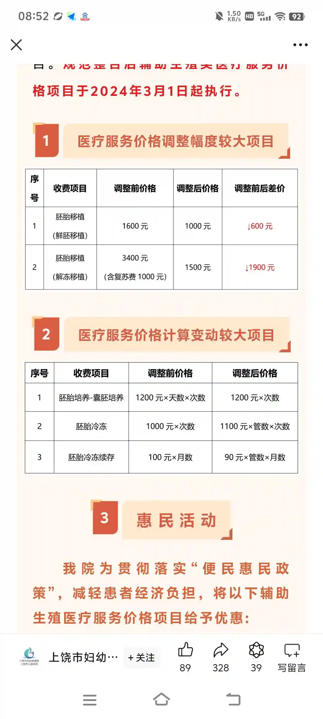 2⃣️一次单纯的促排取卵培育胚胎冷冻胚胎包括保存大概在9千左右,若麻醉取卵需要增加大概1千。我第一次有养囊还需要增加3600。所以一次促排取卵冷冻胚胎花费大概12600。但是江西价目表已经调整,具体见图二,养囊只需1200了,可以少1-2千。胚胎数多的话冷冻费每增加一管多1100,