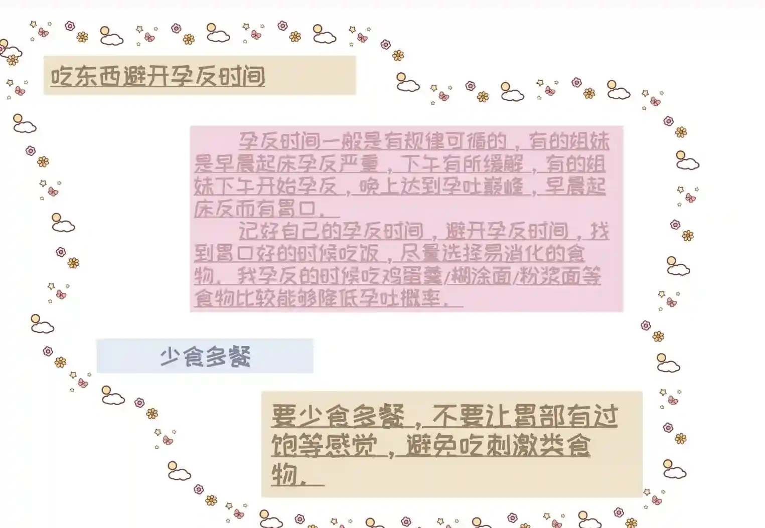 记好自己的晕反时间,避开晕反时间,找到胃口好的时候吃饭,尽量选择易消化的食物。我孕反的时候吃鸡蛋羹/糊涂面/粉浆面等食物比较能够降低孕吐概率。