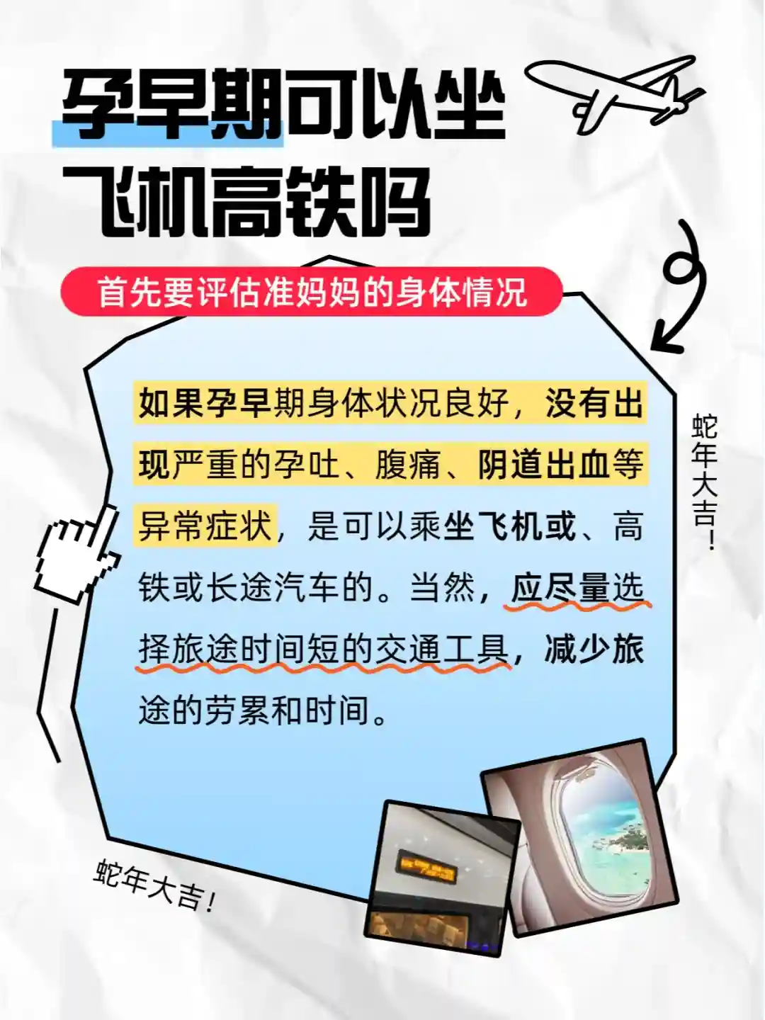 如果孕早期身体状况良好,没有出现严重的孕吐、腹痛、阴道出血等异常症状,是可以乘坐飞机或、高铁或长途汽车的。当然,应尽量选择旅途时间短的交通工具,减少旅途的劳累和时间。