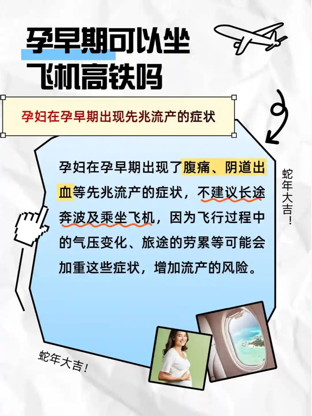 如果孕妇在孕早期出现了腹痛、阴道出血等先兆流产的症状,不建议长途奔波及乘坐飞机,因为飞行过程中的气压变化、旅途的劳累等可能会加重这些症状,增加流产的风险。