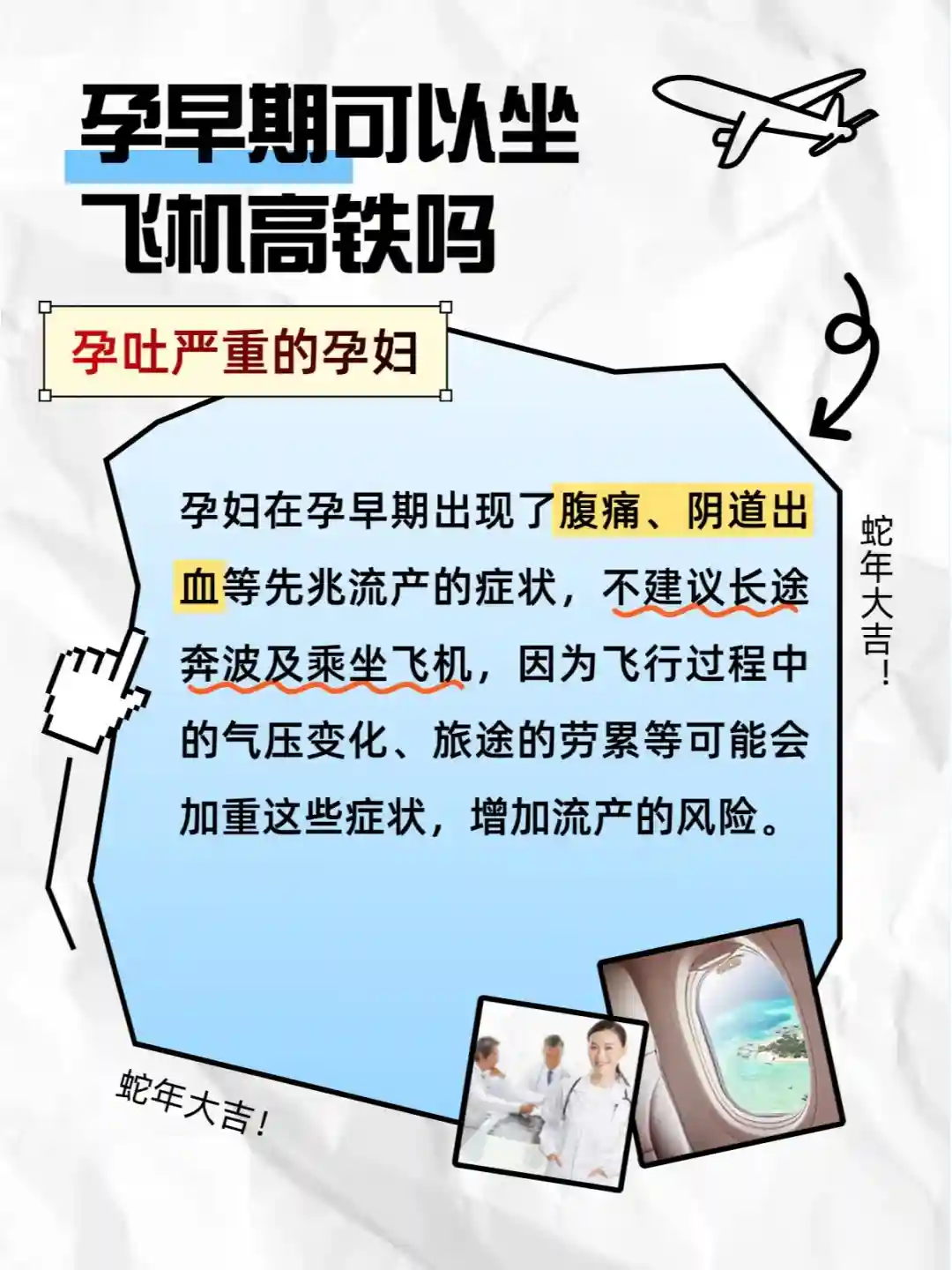 总之,孕早期的孕妇是否适合乘坐飞机或高铁需要根据个人的身体状况和医生的建议来决定。同时,旅行中应注意适当休息,保持良好的心态,如有任何不适,应及时向乘务人员求助。