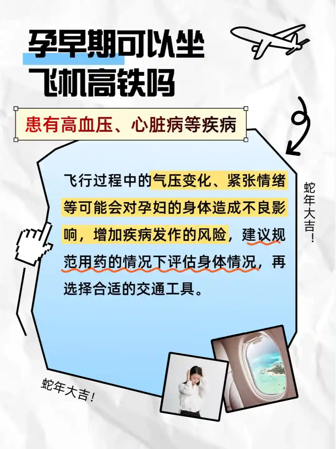 对于患有高血压、心脏病等疾病的准妈妈,飞行过程中的气压变化、紧张情绪等可能会对孕妇的身体造成不良影响,增加疾病发作的风险,建议规范用药的情况下评估身体情况,再选择合适的交通工具。
