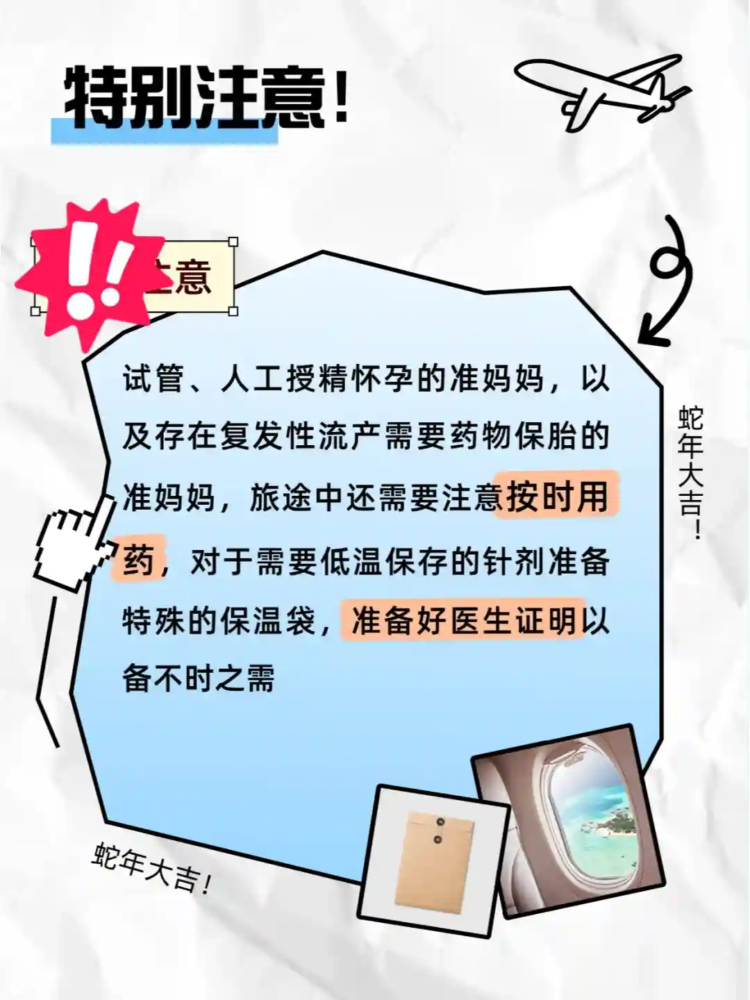 另外,试管、人工授精怀孕的准妈妈,以及存在复发性流产需要药物保胎的准妈妈,旅途中还需要注意按时用药,对于需要低温保存的针剂准备特殊的保温袋,准备好医生证明以备不时之需。