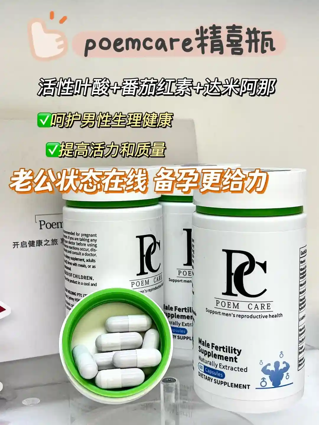 2.补充必要营养素,给老公一直补的是 poemcare精喜瓶,成分很全面,除了活性叶酸以外还添加番茄红素、达米阿那等,对男士备孕有好处,提高男方种子的活性和质量,增加备孕成功率,预防胎儿畸形,坚持了一段时间再去看种子质量都提上来了,喜提双杠感谢它的帮助