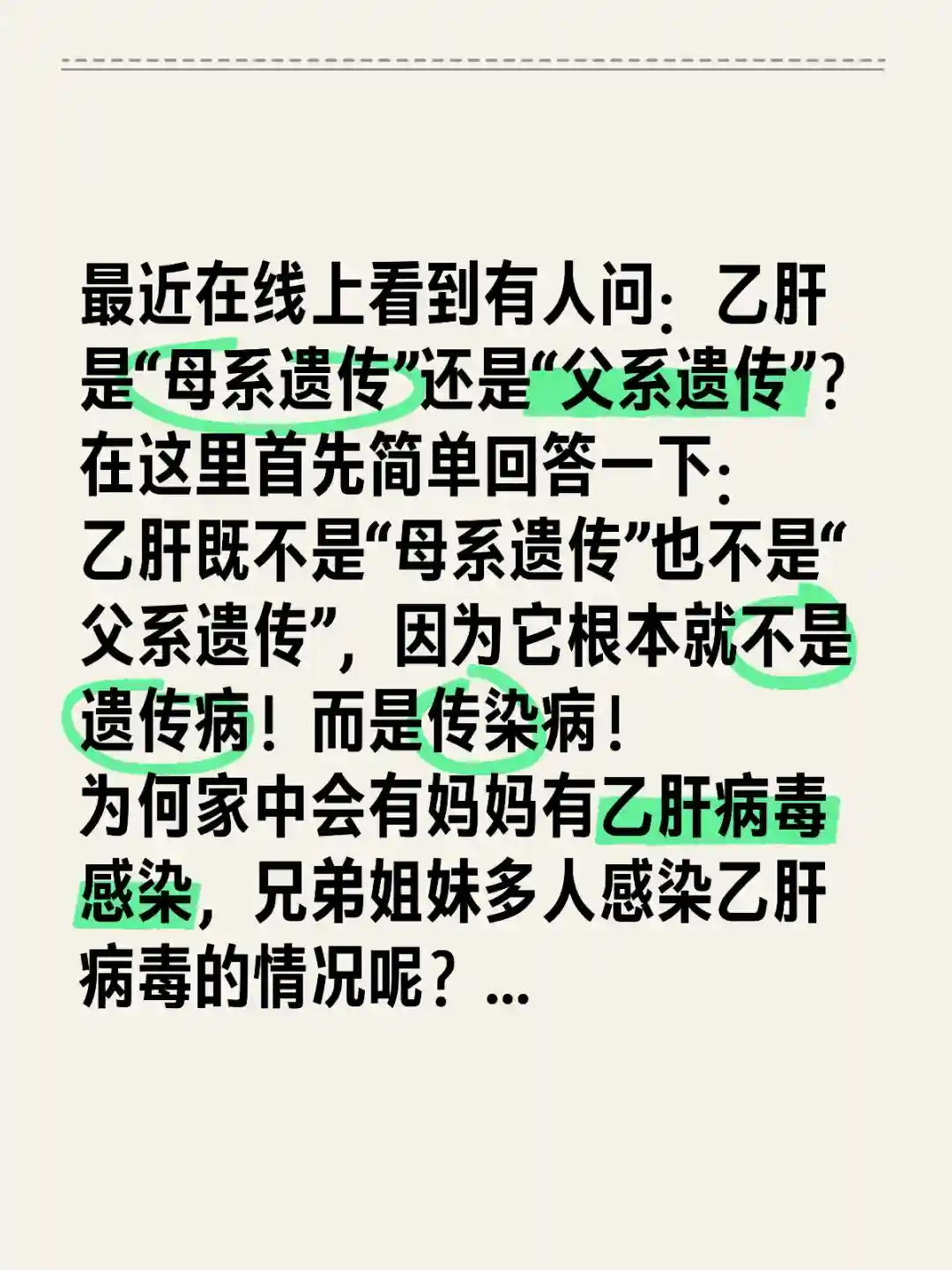 在这里首先简单回答一下:乙肝既不是“母系遗传”也不是“父系遗传”,因为它根本就不是遗传病!而是传染病!