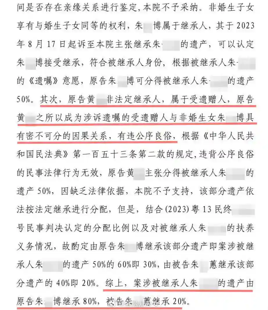 法院判定:遗嘱中非婚生女的部分有效,但赠与黄某的部分因有违公序良俗无效,该部分遗产由婚生女和非婚生女进行法定继承。最终判定非婚生女继承遗嘱中的50%和另一部分的六成(应是法院考虑到朱某博对朱某尽了主要扶养义务,或与朱某共同生活,酌情多分),即总遗产的80%;婚生女朱某惠继承20%。