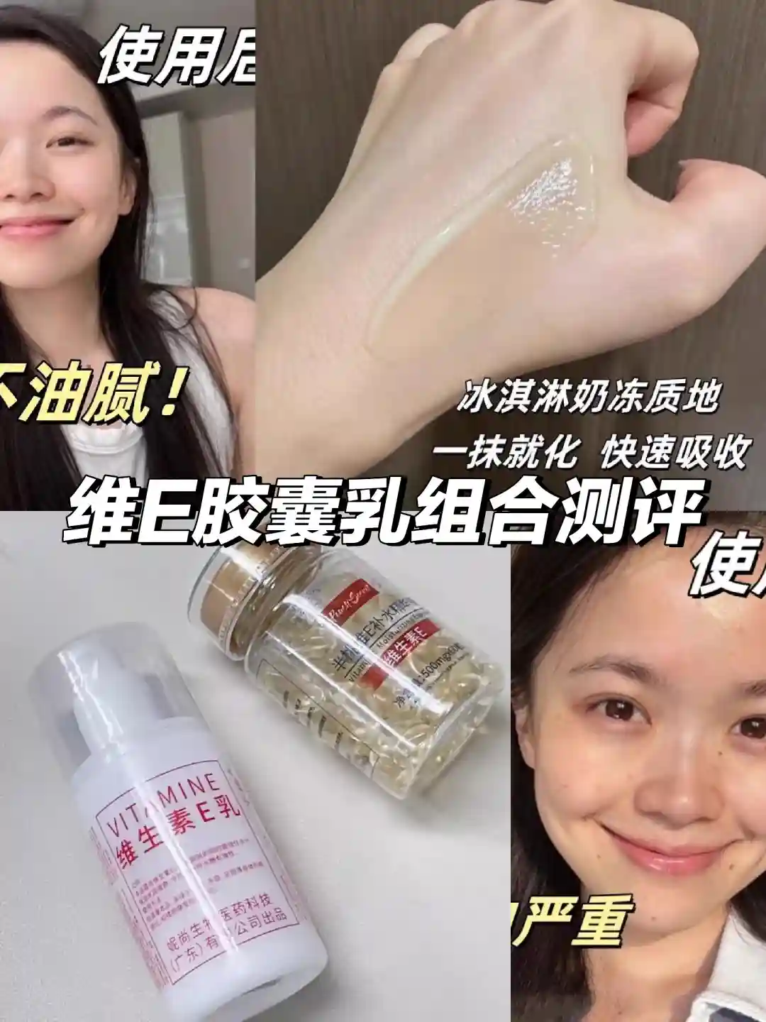 然后我们再来谈谈维生素E乳,它富含维生素E、角鲨烷、透明质酸钠等成分,不仅可以美白、补水、保湿,还能滋润、修复、护肤,让你的肌肤焕发光彩🌟。坚持使用,你还能感受到它对抗初老、淡化细纹的显著效果。