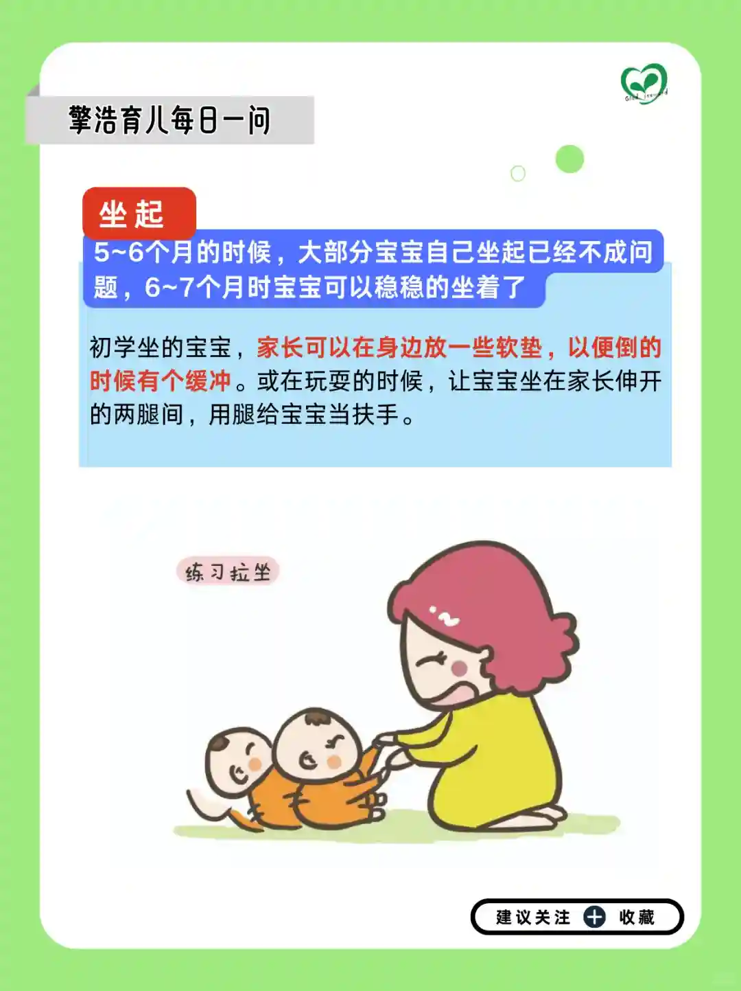 - 独坐:6个月时能双手支撑坐一会儿,7-8个月可以不用支撑独坐很久。