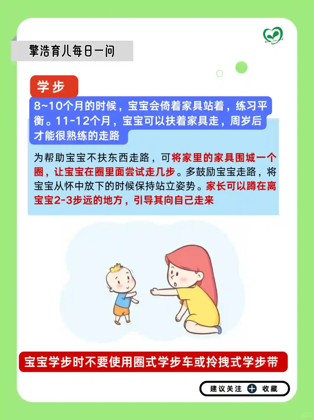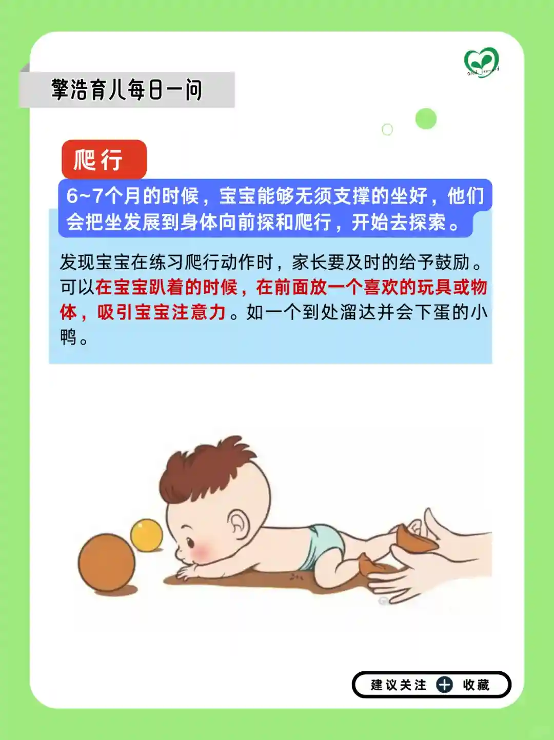 - 爬行:通常在7-8个月开始手膝爬行,像小探险家一样在房间里移动,为站立和行走打基础。