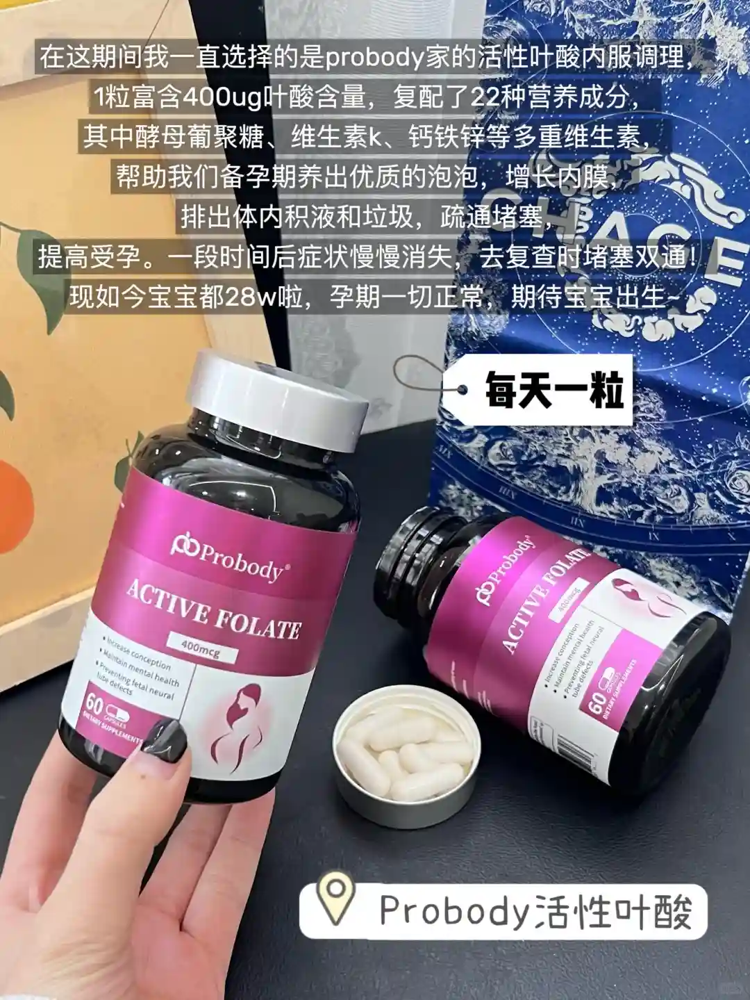 在这期间我一直选择的是probody家的活性叶酸内服调理,1粒富含400ug叶酸含量,复配了22种营养成分,其中酵母葡聚糖、维生素k、钙铁锌等多重维生素,帮助我们备孕期养出优势的泡泡,增长内膜,排出体内积液和垃圾,疏通堵塞,提高受孕。一段时间后症状慢慢消失,去复查时堵塞双通!现如今宝宝都28w啦,孕期一切正常,期待宝宝出生~