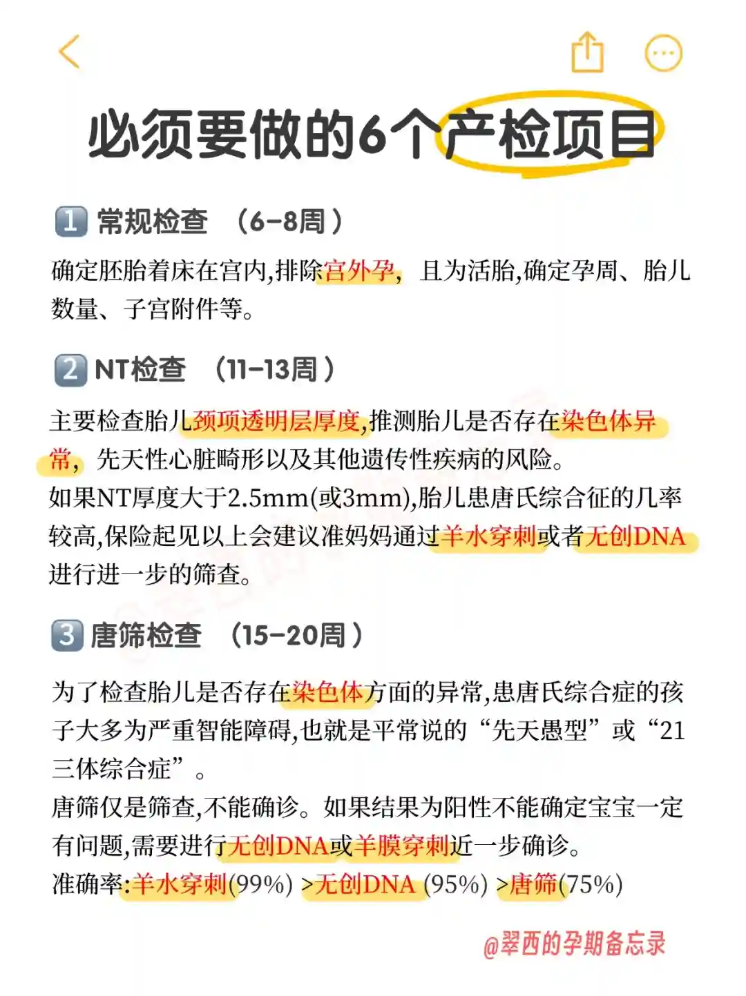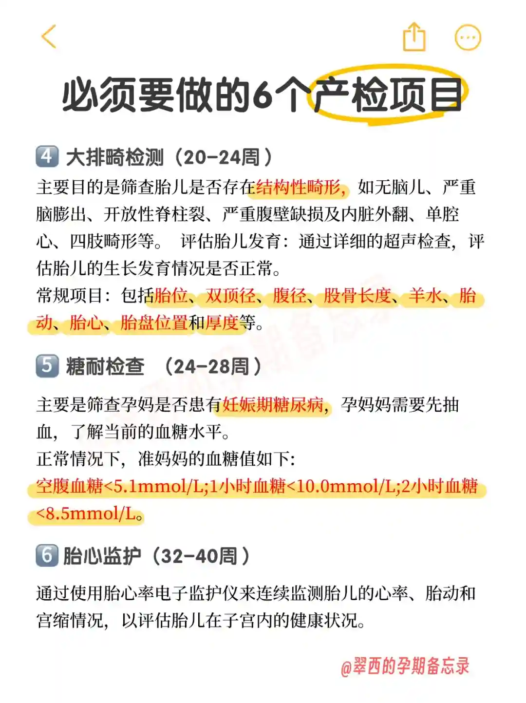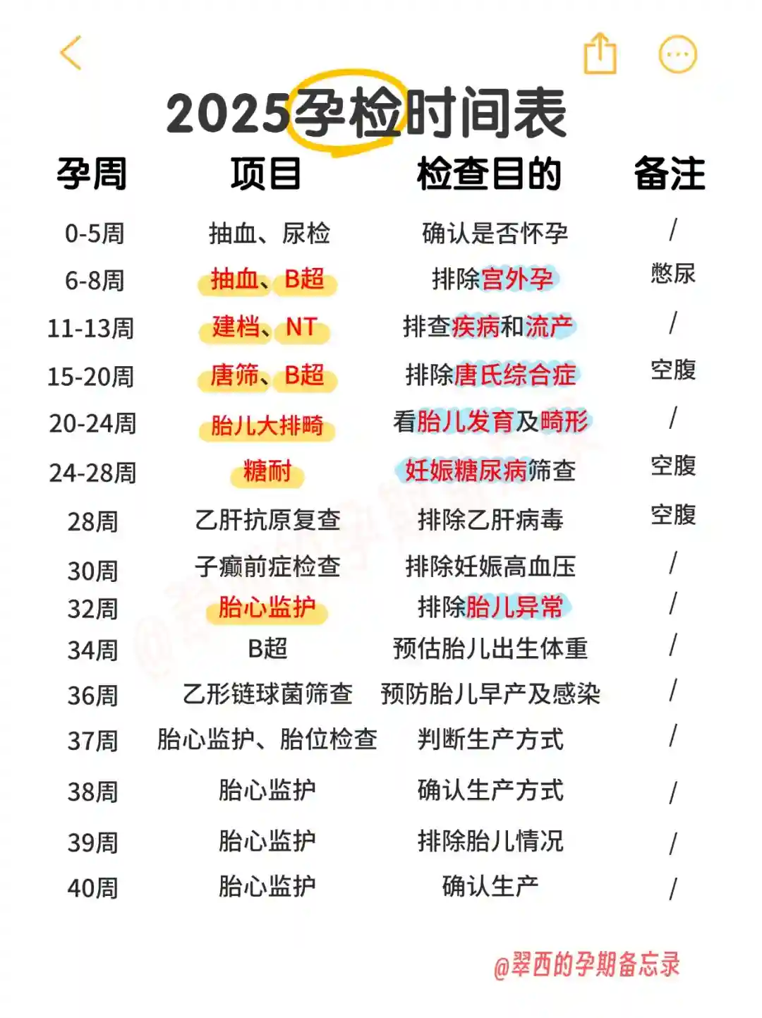 每个孕妈实际情况有所不同,标黄为必查项目噢~