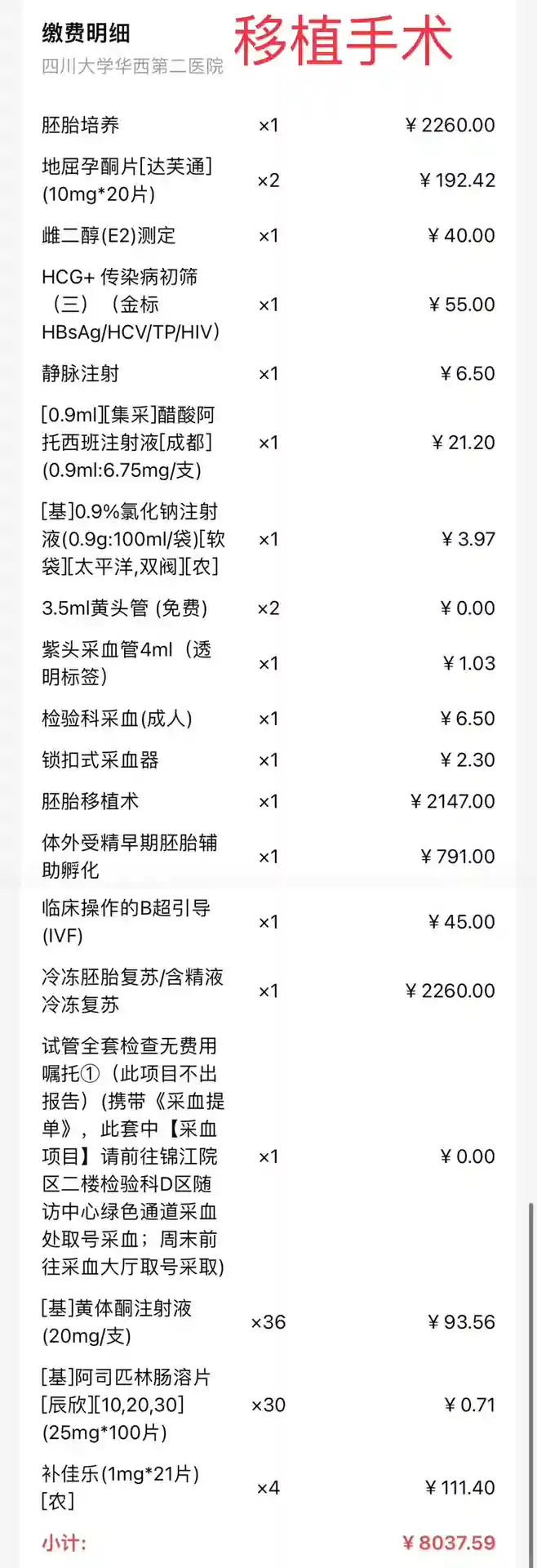 以上就是我做试管在医院花的全部费用,最后希望试管尽快纳入医保只开通个别城市是远远不够的呀,听听人民呐喊的声音吧
