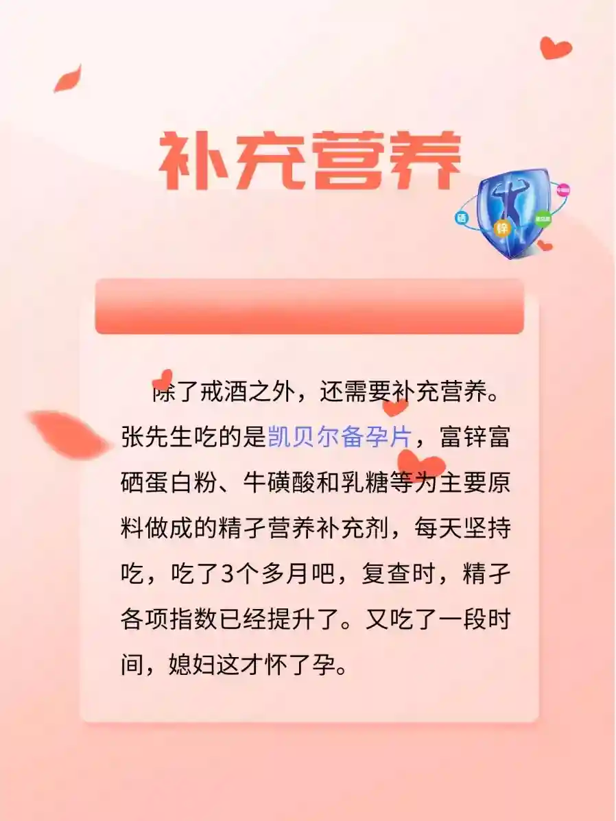 除了戒酒之外,还需要补充营养。张先生吃的是🩸凯贝尔备孕片,🩸富锌富硒蛋白粉、牛磺酸和乳糖等为主要原料做成的精孑营养补充剂,💦💦每天坚持吃,吃了3个多月吧,复查时,精孑各项指数已经提升了。又吃了一段时间,媳妇这才怀了孕。