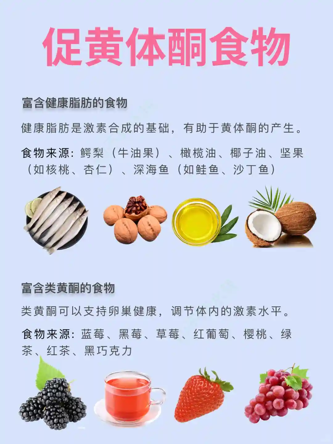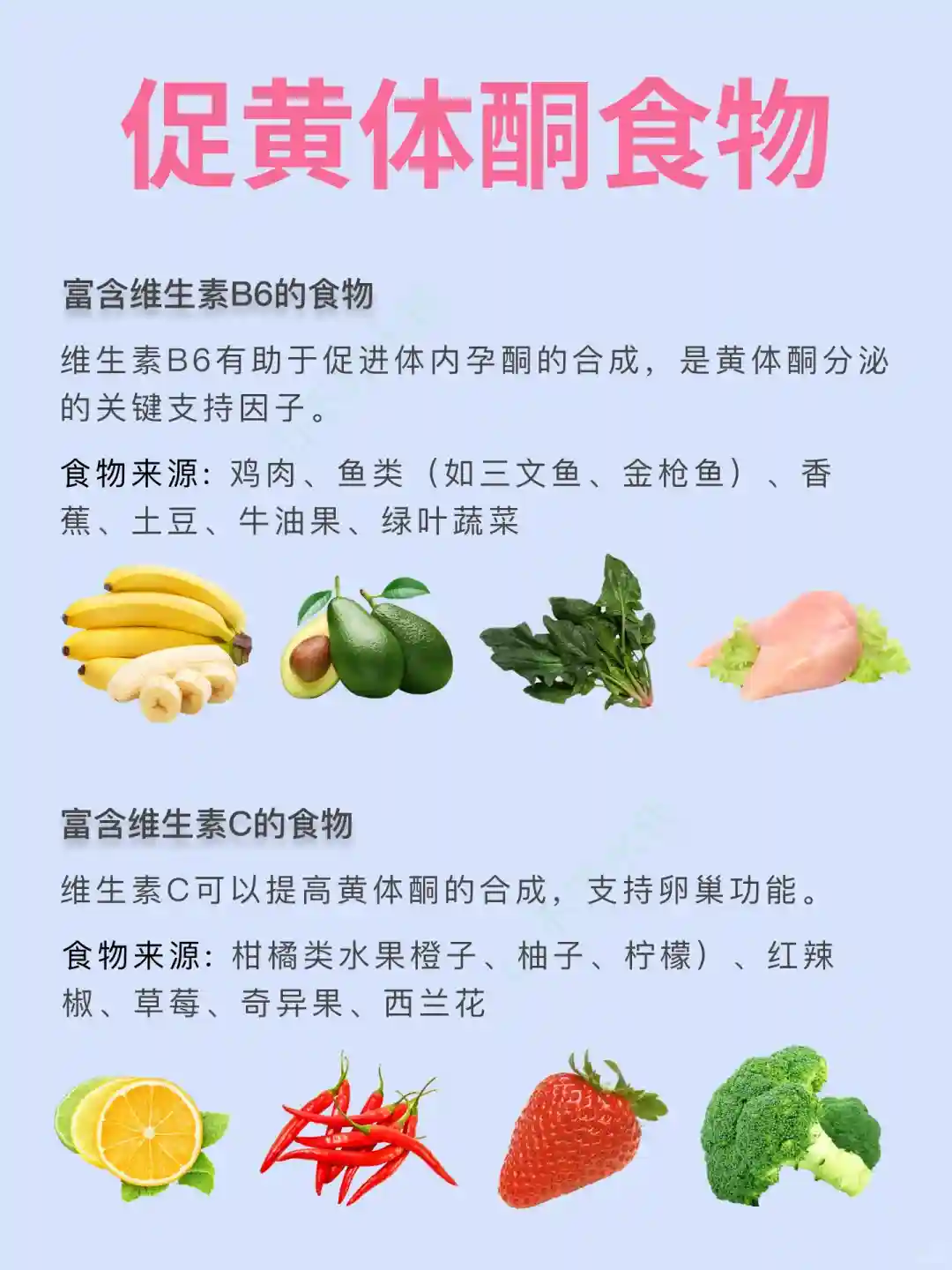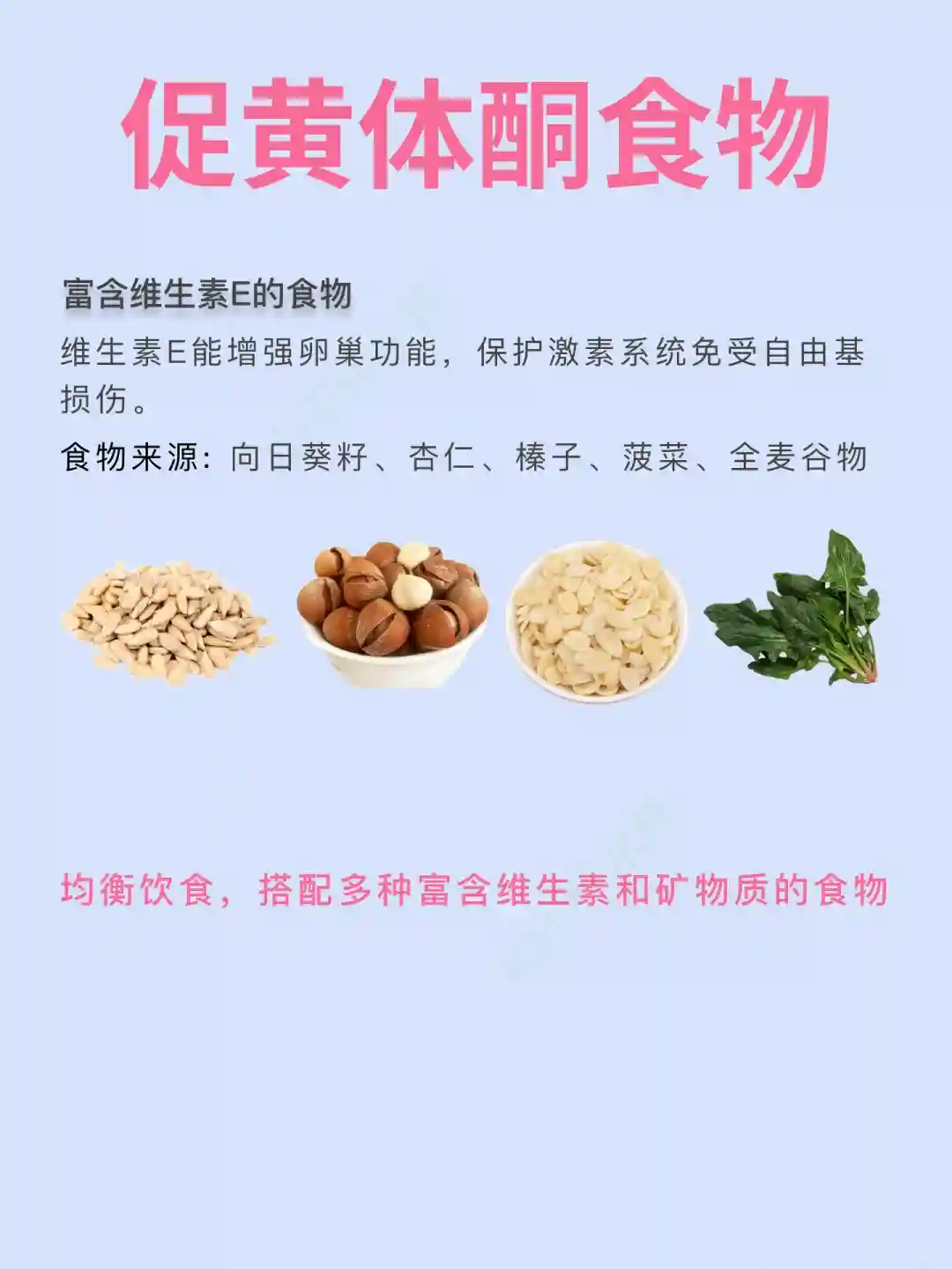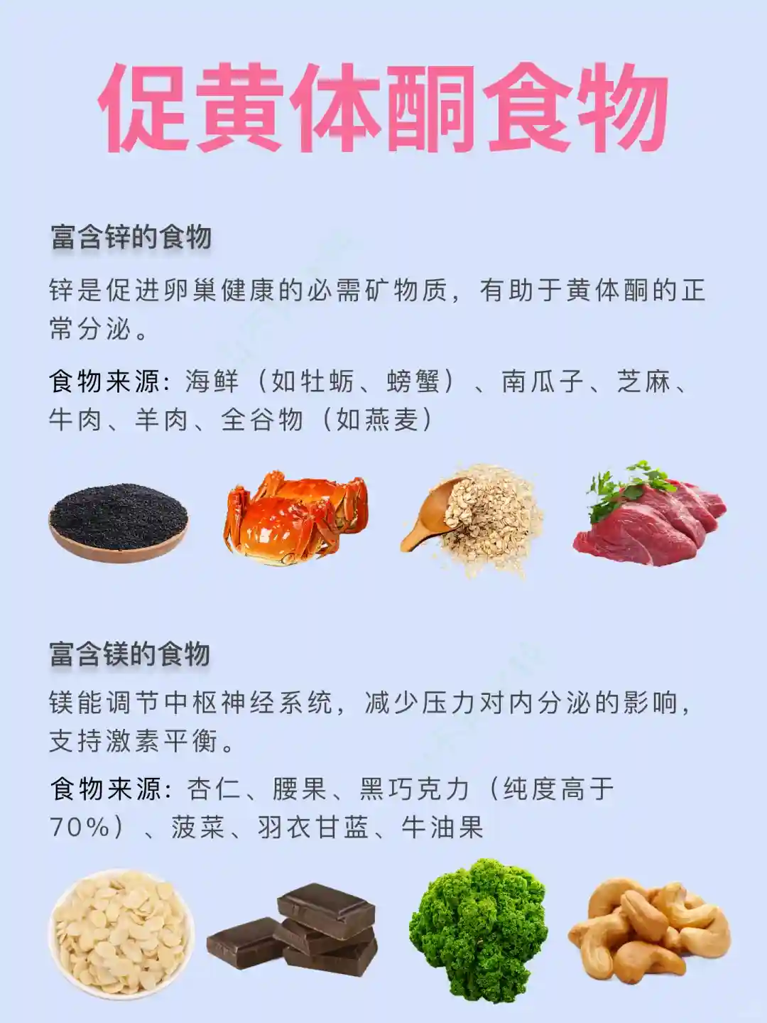 🌟‼️ 补什么:维生素B6、锌、镁、维生素E、健康脂肪等,这些被称为“促进黄体酮生成”的天然来源。