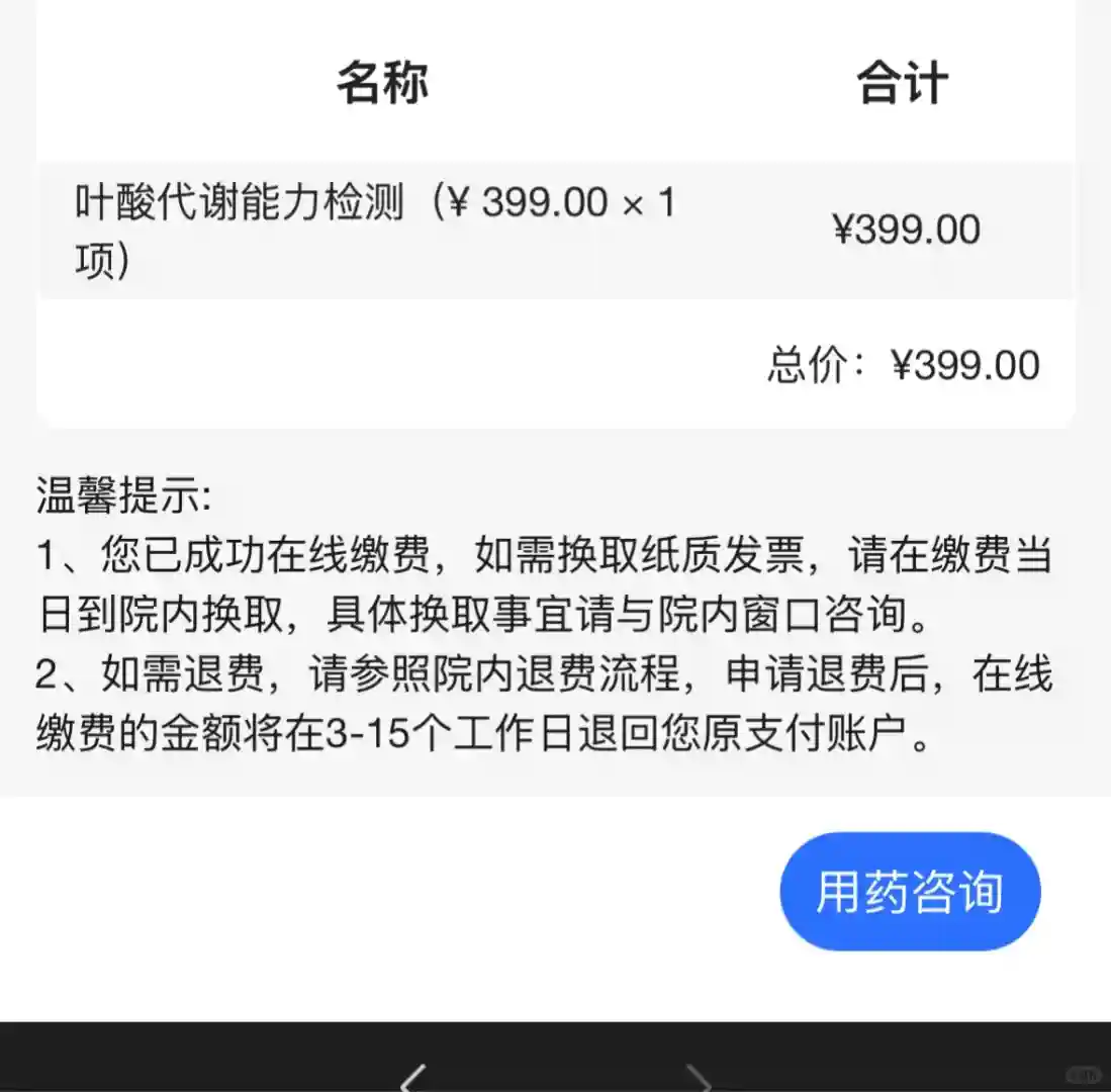 报告无问题后医生会告诉吃什么叶酸,我是需要吃活性叶酸,所以又购入2瓶叶酸共计396元。