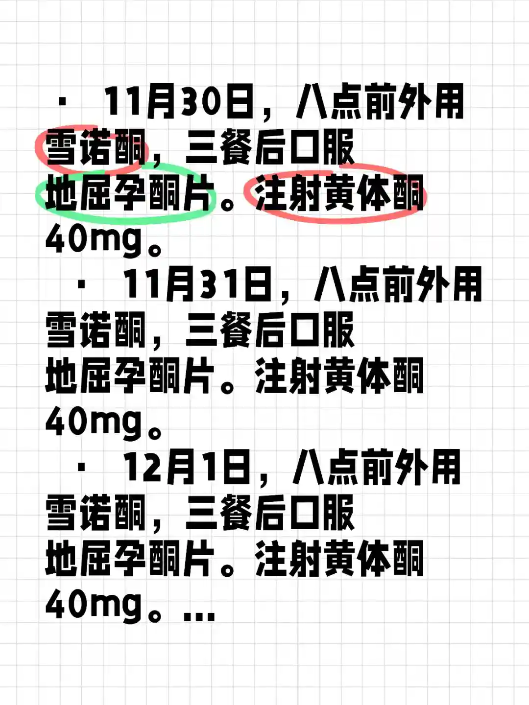 • 12月1日,八点前外用雪诺酮,三餐后口服地屈孕酮片。注射黄体酮40mg。