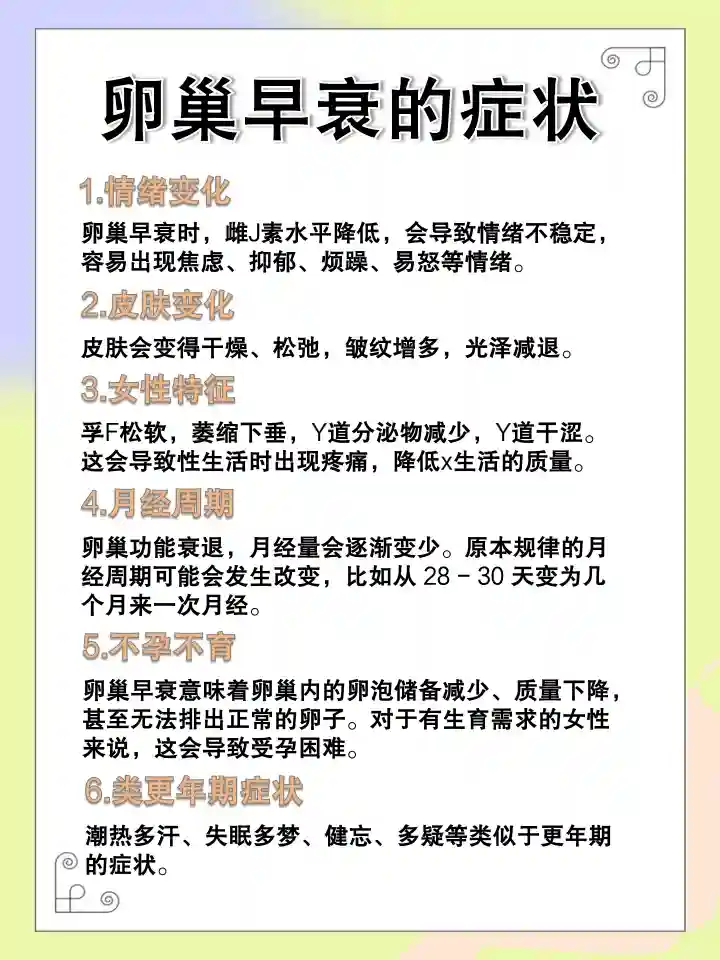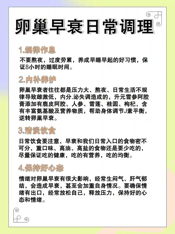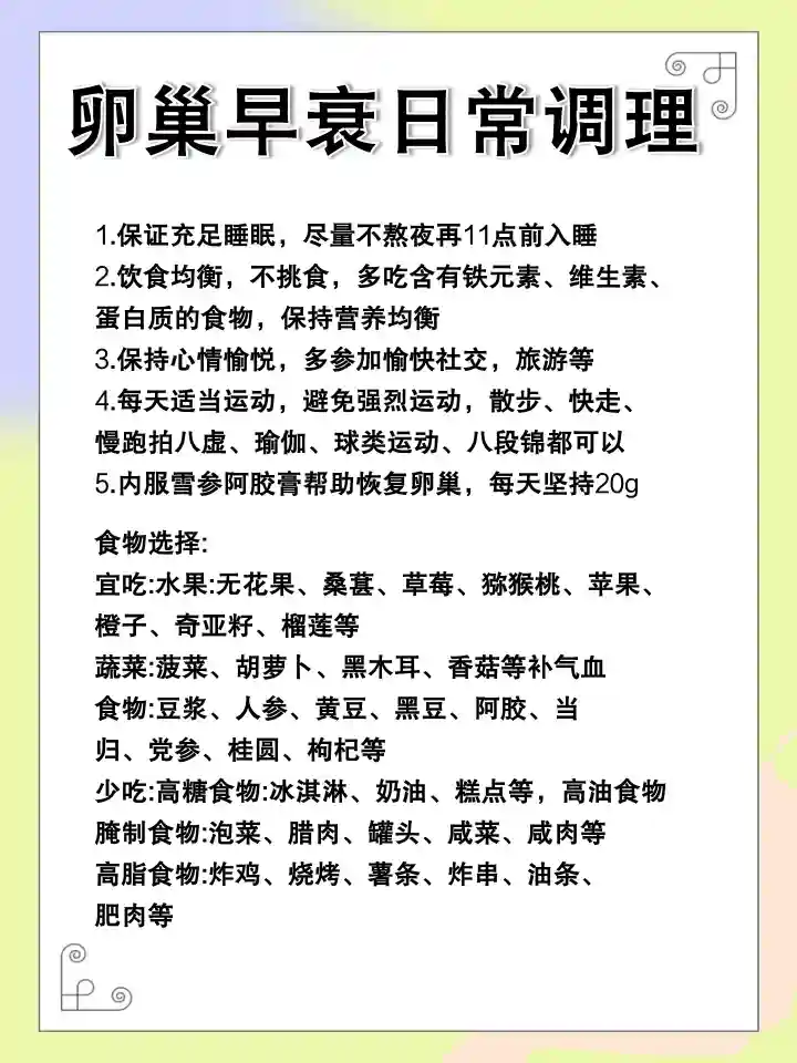 情绪对卵巢早衰有很大影响,经常生闷气、肝气郁结,会造成 早 缞,甚至会加重自身情况。要确保情绪有出口,经常放松自己,释放鸭梨,保持好的心态和情绪。