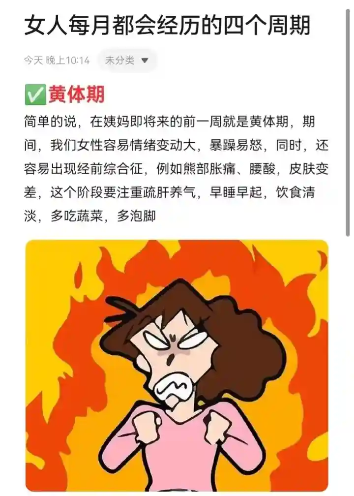 简单的说,在姨妈即将来的前一周就是黄体期,期间,我们女性容易情绪变动大,暴躁易怒,同时,还容易出现经前综合征,例如熊部胀痛、腰酸,皮肤变差,这个阶段要注重疏肝养气,早睡早起,饮食清淡,多吃蔬菜,多泡脚