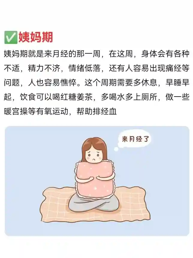 姨妈期就是来月经的那一周,在这周,身体会有各种不适,精力不济,情绪低落,还有人容易出现痛经等问题,人也容易憔悴。这个周期需要多休息,早睡早起,饮食可以喝红糖姜茶,多喝水多上厕所,做一些暖宫操等有氧运动,帮助排经血