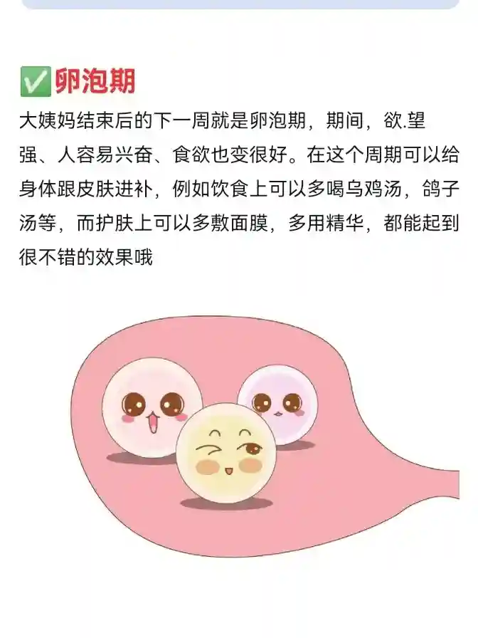 大姨妈结束后的下一周就是卵泡期,期间,欲.望强、人容易兴奋、食欲也变很好。在这个周期可以给身体跟皮肤进补,例如饮食上可以多喝乌鸡汤,鸽子汤等,而护肤上可以多敷面膜,多用精华,都能起到很不错的效果哦
