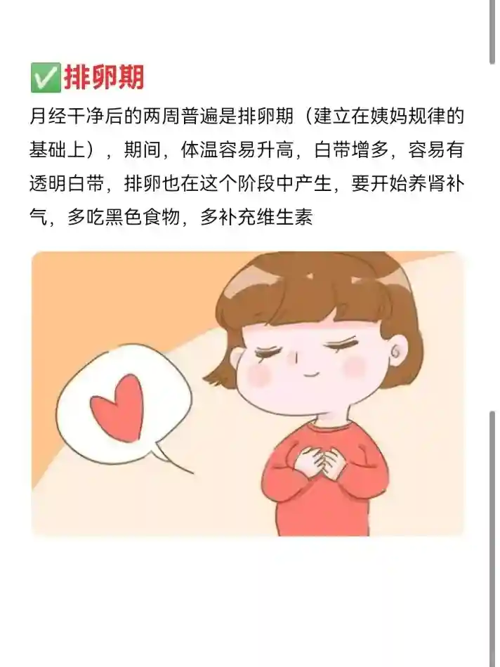 月经干净后的两周普遍是排卵期(建立在姨妈规律的基础上),期间,体温容易升高,白带增多,容易有透明白带,排卵也在这个阶段中产生,要开始养肾补气,多吃黑色食物,多补充维生素#月经 #月经周期#月经周期你知道多少 #关爱女性内分泌健康 #