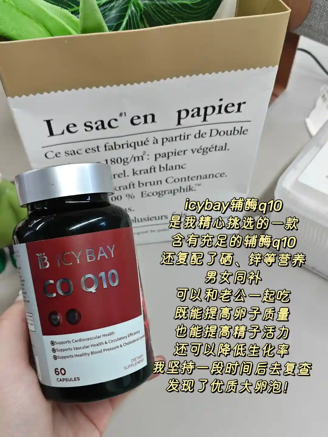 我在备孕期补充的是icybay辅酶q10,补充辅酶q10可以为卵子补充营养,还可以提高精子活力,卵子、精子好了,试管自然容易成功,还可以降低生化率,这样也能少受点罪